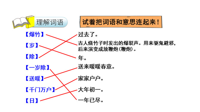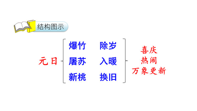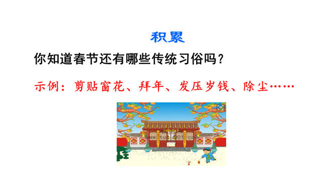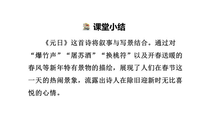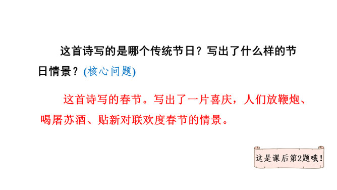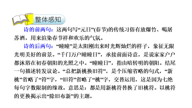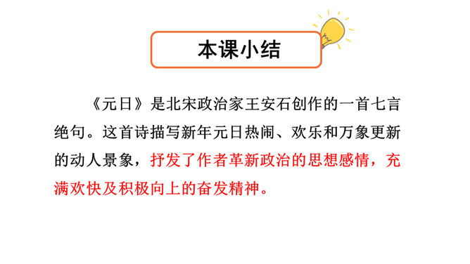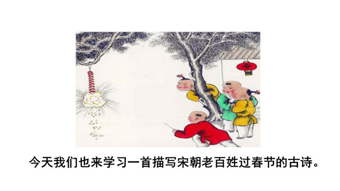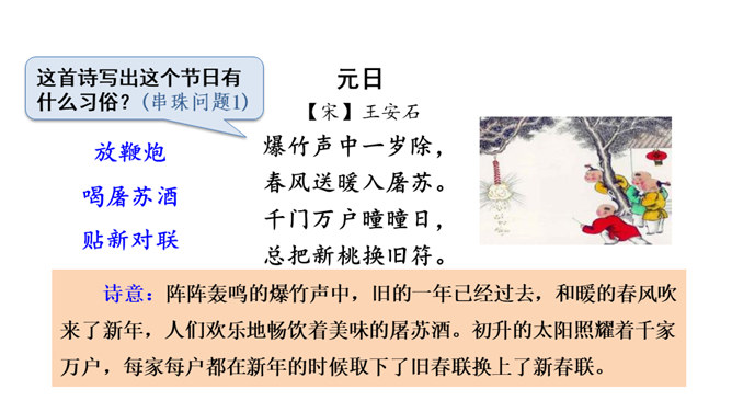 1.请同学们自由朗读古诗,努力读准字音、读通句子。2.标注有疑惑的地方,批注感受深刻的地方。核心问题:这首诗写的是哪个传统节日?写出了什么样的节日情景?串珠问题:这首诗写出这个节日有什么习俗?诗的前两句:这两句写“元日”(春节)的传统习俗有放爆竹、喝屠苏酒,用来渲染春节祥和欢乐的气氛。诗的后两句:“曈曈”是太阳刚出来时光辉灿烂的样子,象征无限光明美好的前景。“千门万户曈曈日”,承接前面诗意。所属专题:元日ppt。