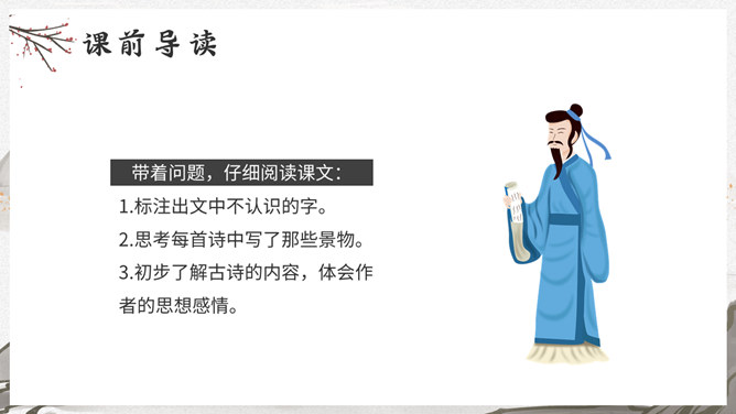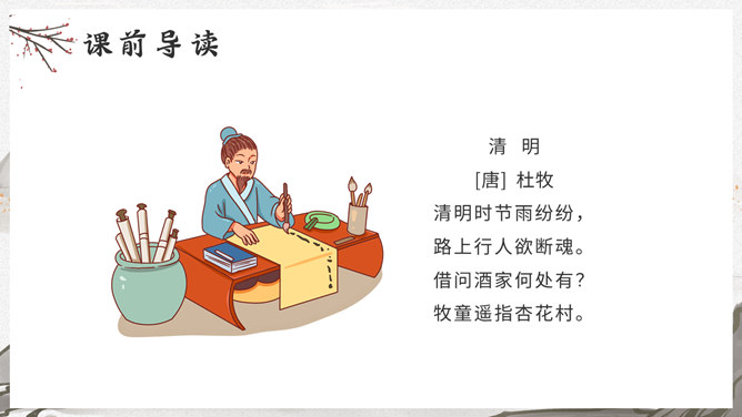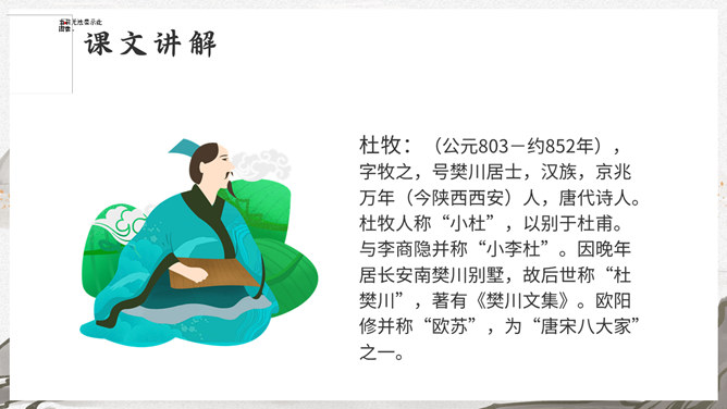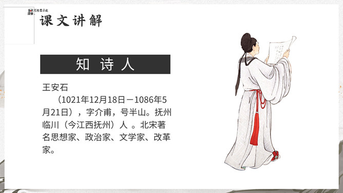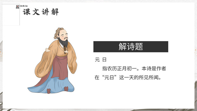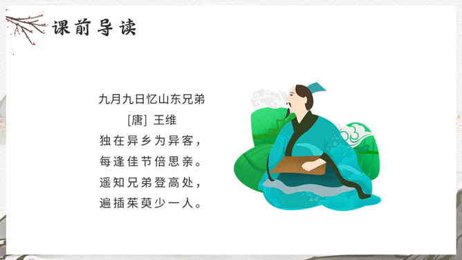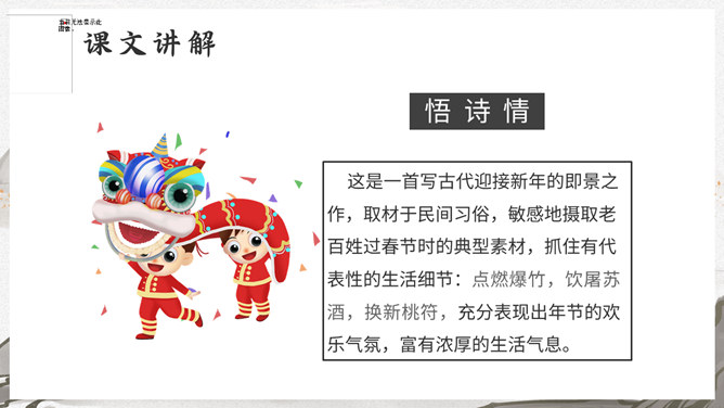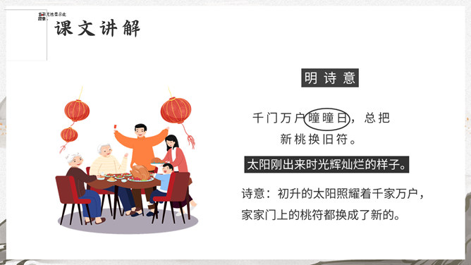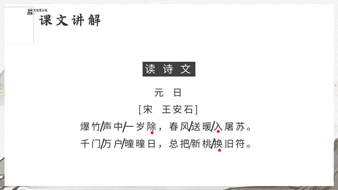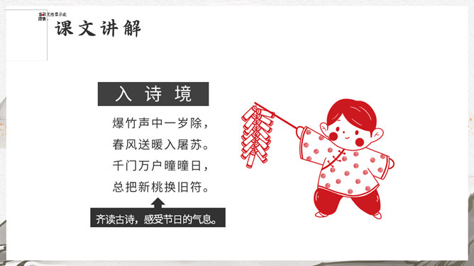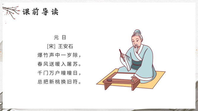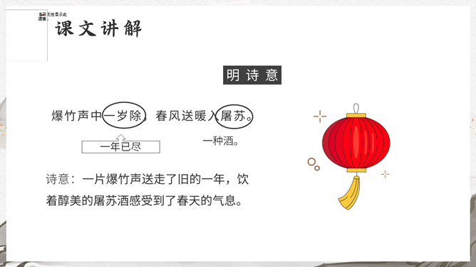 这是一首写古代迎接新年的即景之作,取材于民间习俗,敏感地摄取老百姓过春节时的典型素材,抓住有代表性的生活细节:点燃爆竹,饮屠苏酒,换新桃符,充分表现出年节的欢乐气氛,富有浓厚的生活气息。本诗描写了清明雨中所见,色彩清淡,心境凄冷,好在找到了解脱的形式---- 饮酒。此诗写出了游子的思乡怀亲之情。诗一开头便紧切题目,写异乡异土生活的孤独凄然,因而时时怀乡思人,遇到佳节良辰,思念倍加。