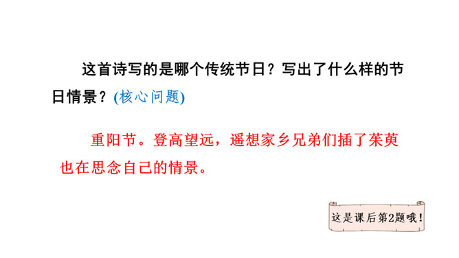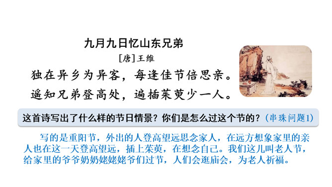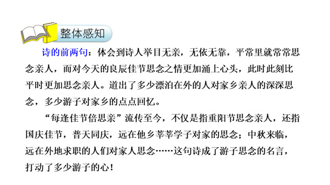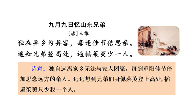 是盛唐著名诗人王维因重阳节思念家乡的亲人而作。诗人一开头便紧急切题,写异乡异土生活的孤独凄然,遇到佳节良辰,思念倍加。接着诗一跃而写远在家乡的兄弟,按照重阳的风俗而登高时,也在怀念自己。诗意反复跳跃,含蓄深沉,既朴素自然,又曲折有致。“每逢佳节倍思亲”千百年来,成为游子思念的名言,打动多少游子离人之心。围绕一个意思把一段话写清楚是语文学习必须具备的一种能力,古诗也不例外。所属专题:九月九日忆山东兄弟ppt。