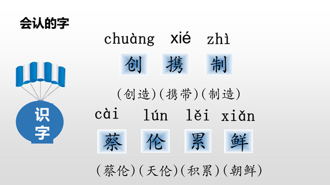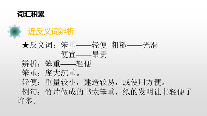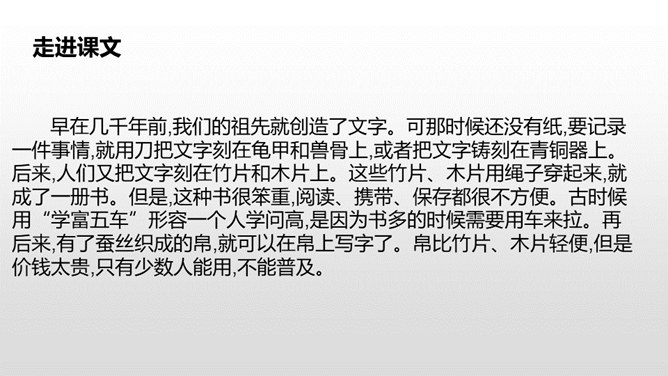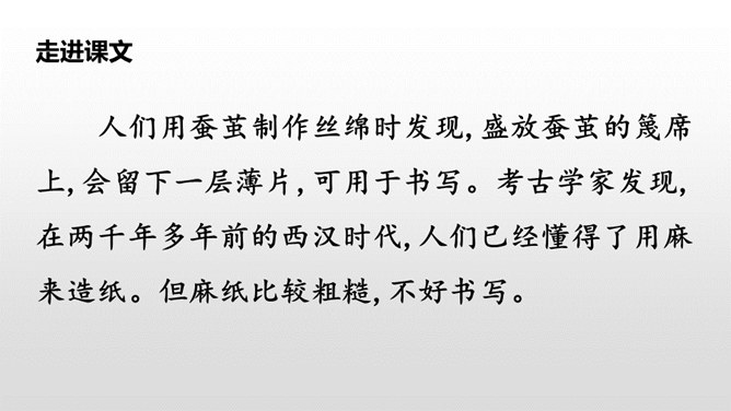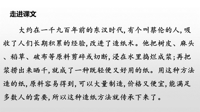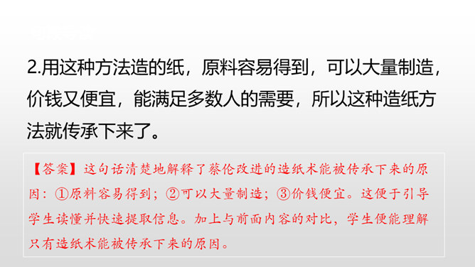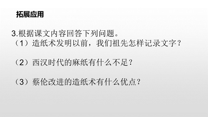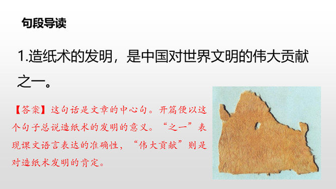 这句话是文章的中心句。开篇便以这个句子总说造纸术的发明的意义。“之一”表现课文语言表达的准确性,“伟大贡献”则是对造纸术发明的肯定。这句话清楚地解释了蔡伦改进的造纸术能被传承下来的原因:①原料容易得到;②可以大量制造;③价钱便宜。这便于引导学生读懂并快速提取信息。加上与前面内容的对比,学生便能理解只有造纸术能被传承下来的原因。根据课文内容回答下列问题。造纸术发明以前,我们祖先怎样记录文字?所属专题:纸的发明ppt。