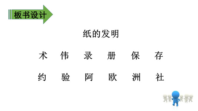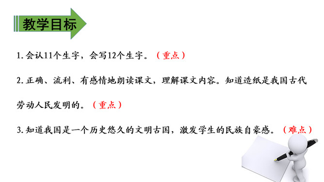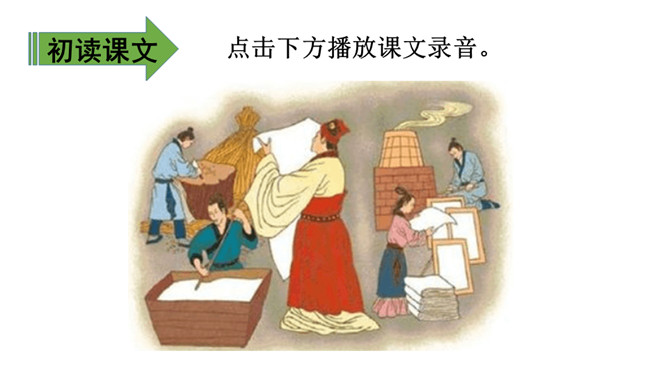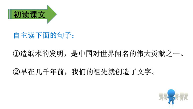 教学目标:1.会认11个生字,会写12个生字。(重点)2.正确、流利、有感情地朗读课文,理解课文内容。知道造纸是我国古代劳动人民发明的。(重点)3.知道我国是一个历史悠久的文明古国,激发学生的民族自豪感。(难点)会认11个生字,会写12个生字。(重点)自主读下面的句子:①造纸术的发明,是中国对世界闻名的伟大贡献之一。②早在几千年前,我们的祖先就创造了文字。所属专题:纸的发明ppt。