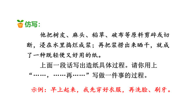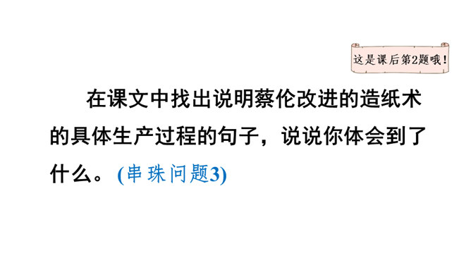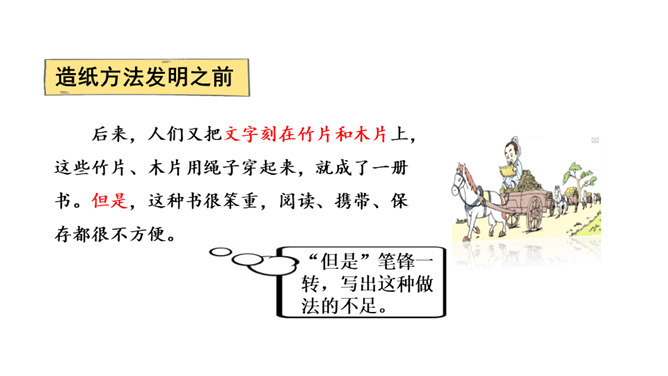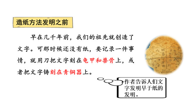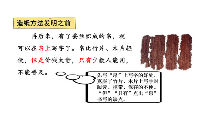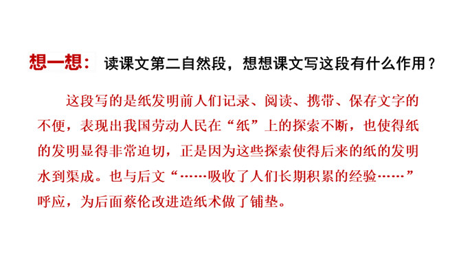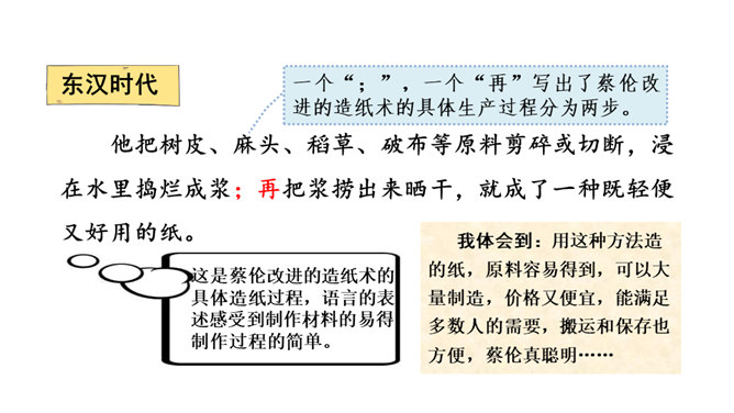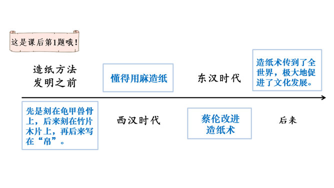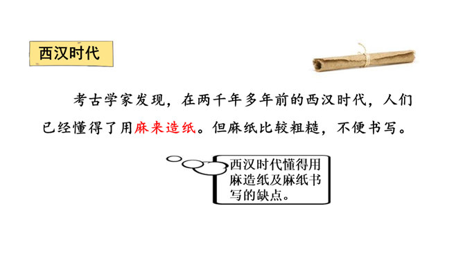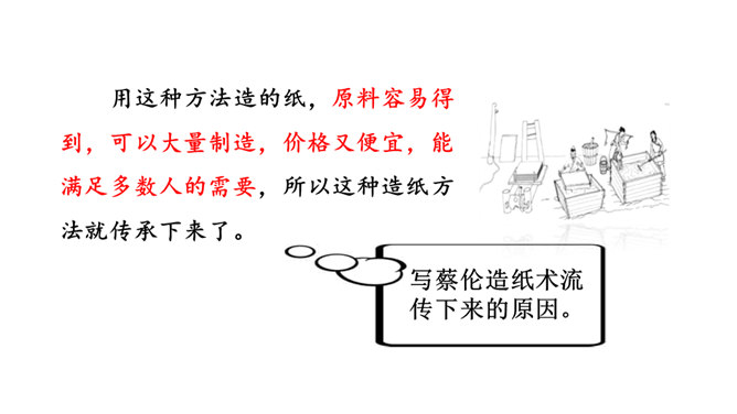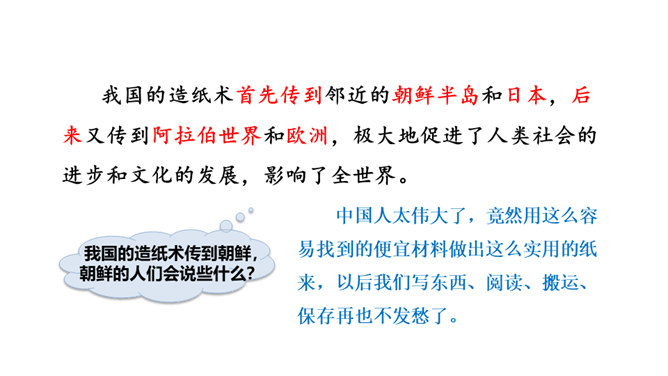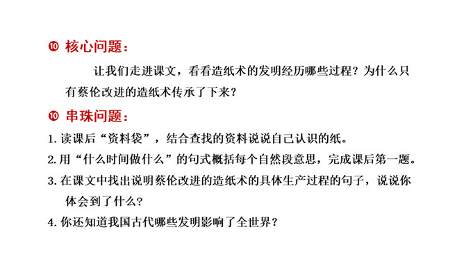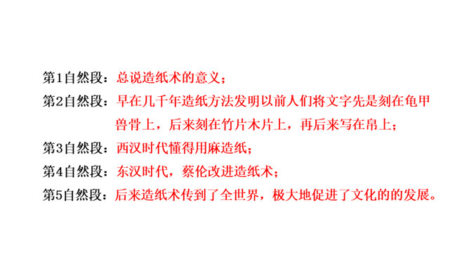 课文按照时间的先后顺序记叙了造纸术的发明过程、每个过程对人们生活的影响,以及我国造纸术发明及传播,对人类社会进步的促进与影响。了解国情历史,具有文化自信,尊重民族优秀文化成果。课文按照时间的先后顺序记叙了造纸术的发明经过,明白了蔡伦改进的造纸术传承下来的原因。赞颂了我们祖先的创造业绩。在体会课文思想感情的同时,我学习了能按时间先后顺序理出课文的条理。所属专题:纸的发明ppt。