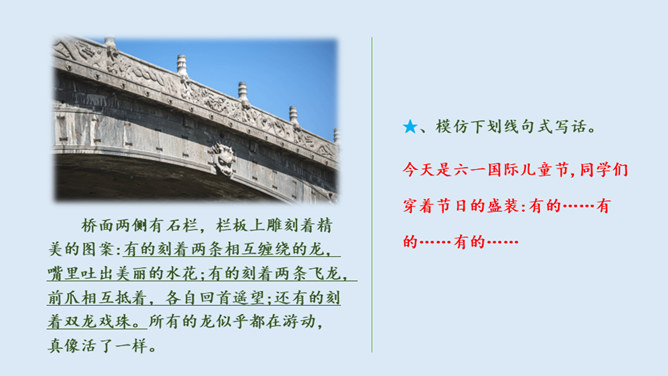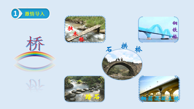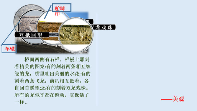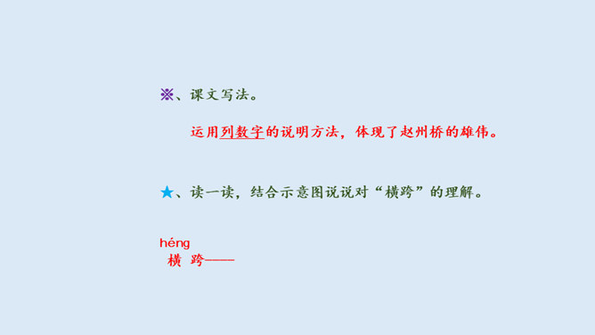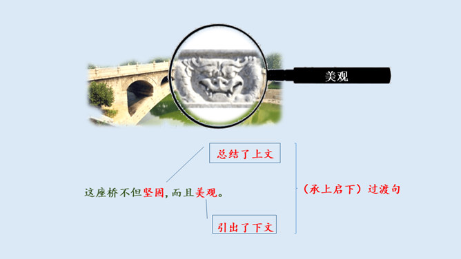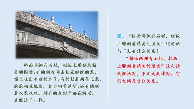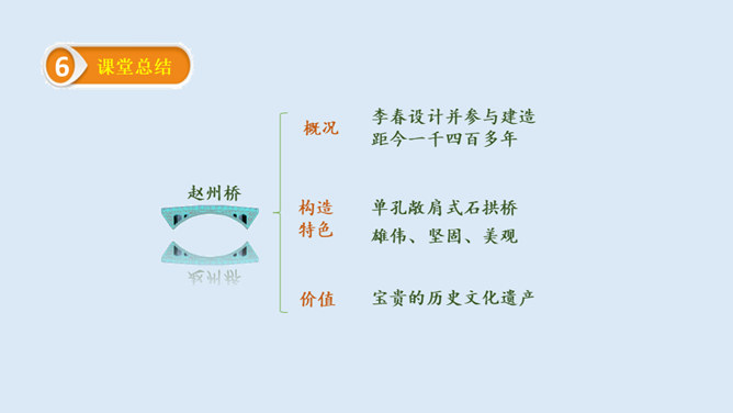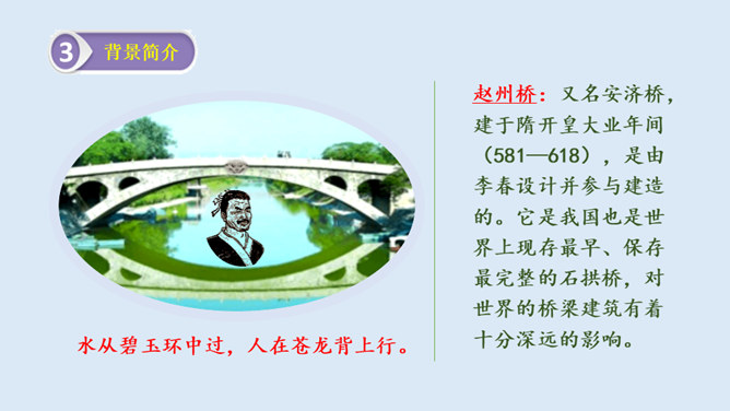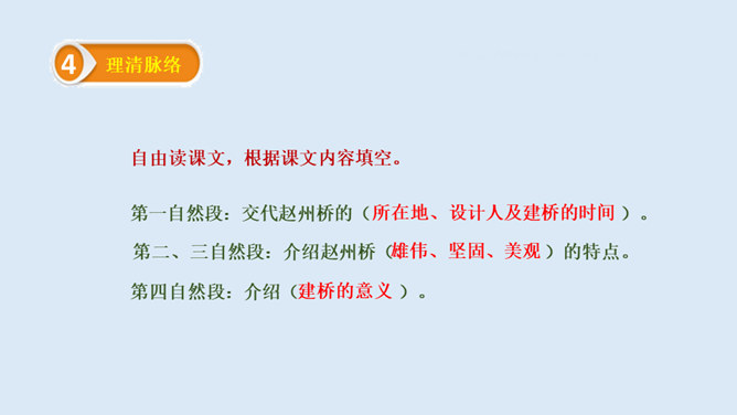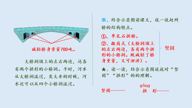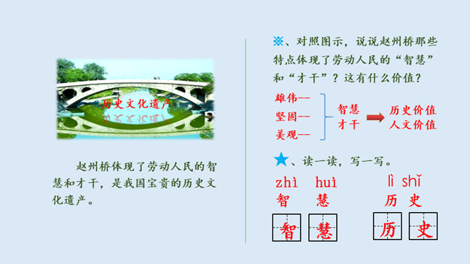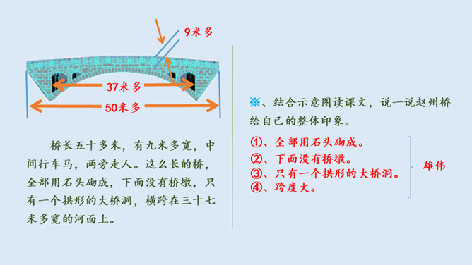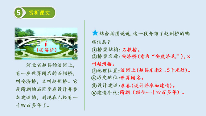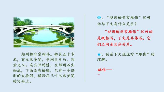 自由读课文,根据课文内容填空。第一自然段:交代赵州桥的(所在地、设计人及建桥的时间)。第二、三自然段:介绍赵州桥(雄伟、坚固、美观)的特点。第四自然段:介绍(建桥的意义)。“桥面两侧有石栏,栏板上雕刻着精美的图案”这句话是概括写,下文是具体写。它们之间是总分关系。对照图示,说说赵州桥那些特点体现了劳动人民的“智慧”和“才干”?这有什么价值?所属专题:赵州桥ppt。