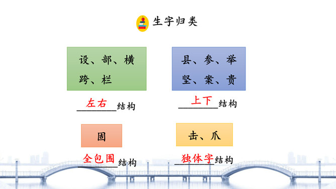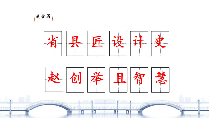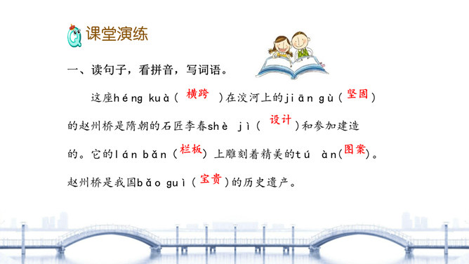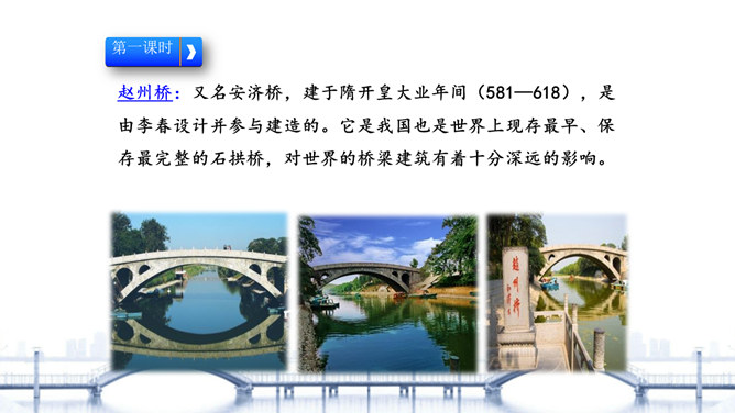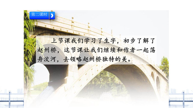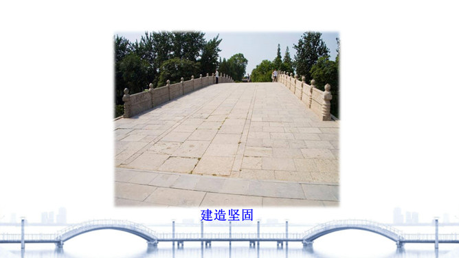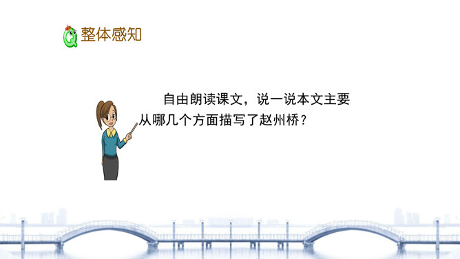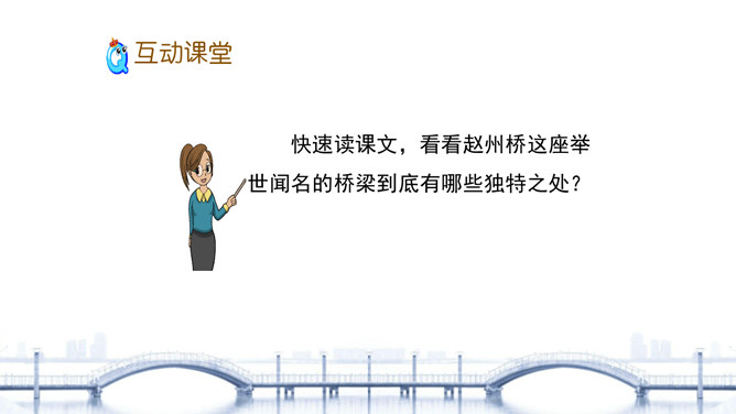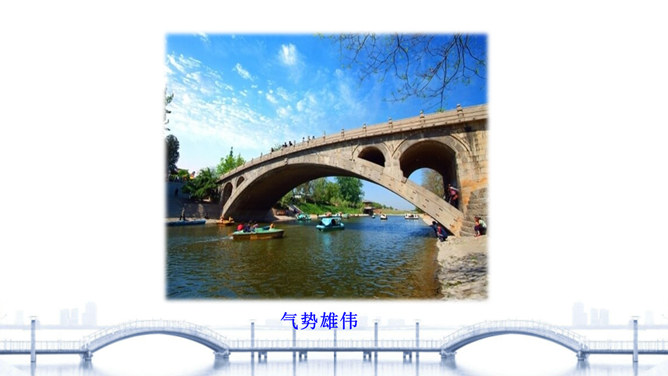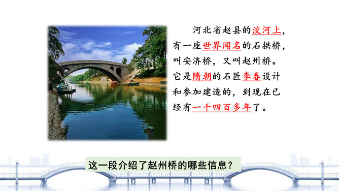 “雄伟”是什么意思? 一般用来形容什么?从课文的哪些语句中体会出了赵州桥的雄伟?在课文中画出来。“雄伟”一般用来形容雄壮伟大的事物。运用“五十多米”“九米”“三十七米”等具体数字介绍了赵州桥的长度和宽度,是列数字的说明方法,体现了赵州桥的雄伟壮观。思考:赵州桥在设计上的特点有哪些?赵州桥全部用石头砌成,桥下没有桥墩,只有一个大桥洞和四个小桥洞。细读第3自然段,说说“美观”表现在哪里?所属专题:赵州桥ppt。