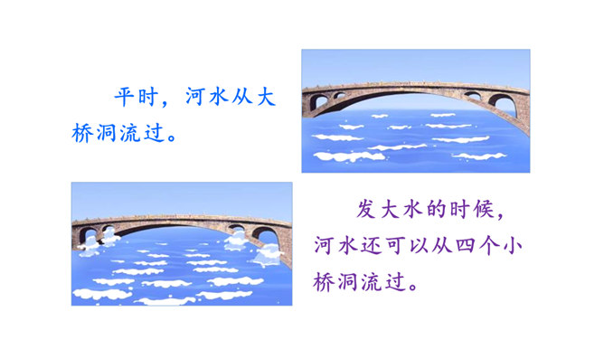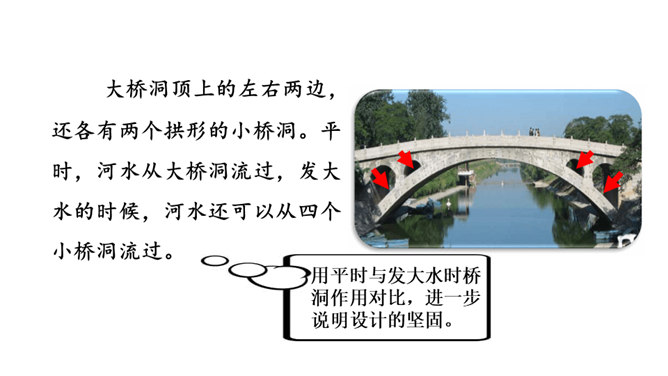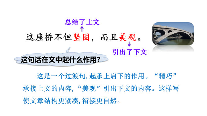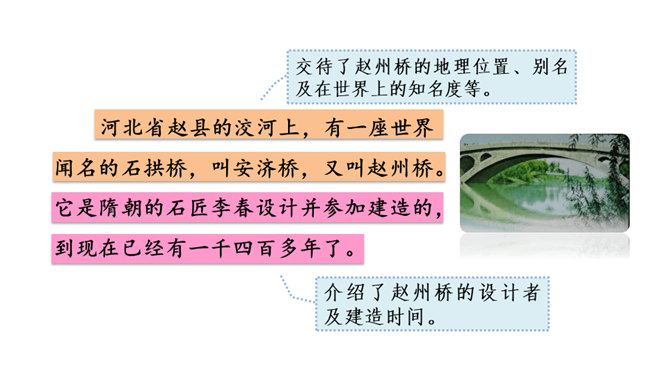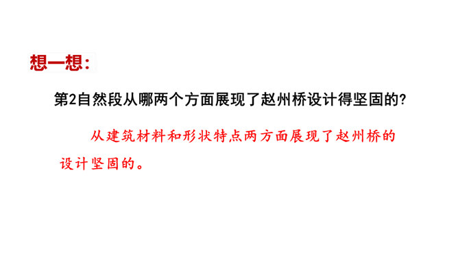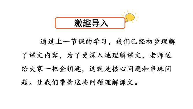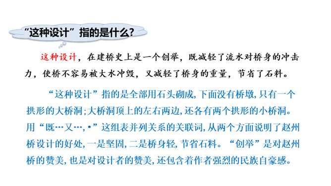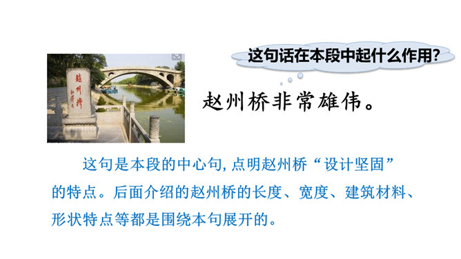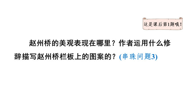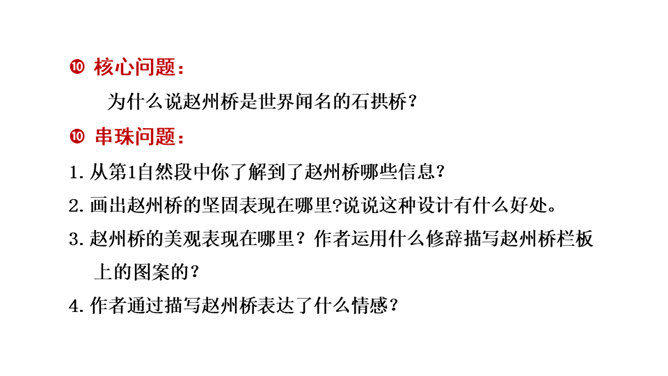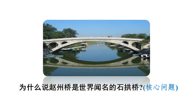 通过上一节课的学习,我们已经初步理解了课文内容,为了更深入地理解课文,老师送给大家一把金钥匙,这就是核心问题和串珠问题。让我们带着这些问题理解课文。核心问题:为什么说赵州桥是世界闻名的石拱桥?串珠问题:1.从第1自然段中你了解到了赵州桥哪些信息?2.画出赵州桥的坚固表现在哪里?说说这种设计有什么好处。3.赵州桥的美观表现在哪里?作者运用什么修辞描写赵州桥栏板上的图案的?4.作者通过描写赵州桥表达了什么情感?所属专题:赵州桥ppt。
