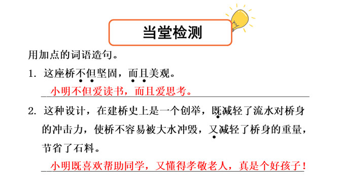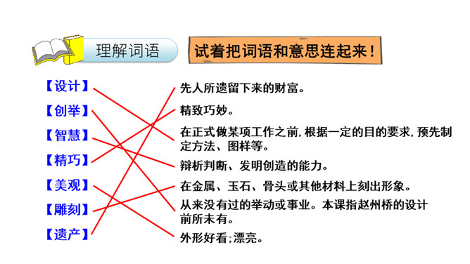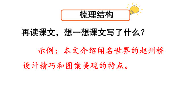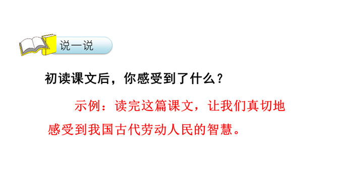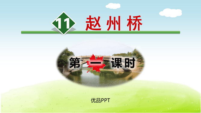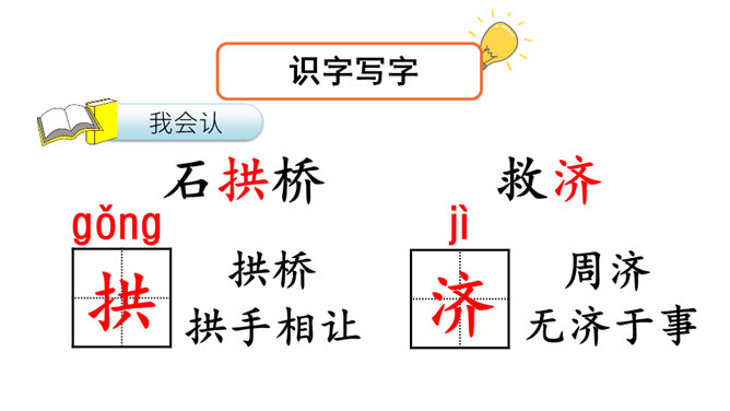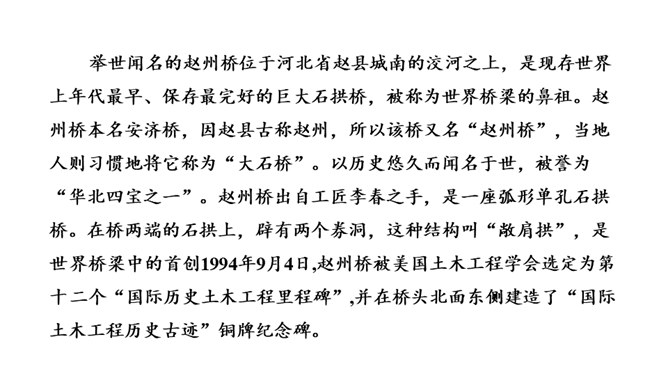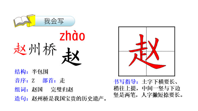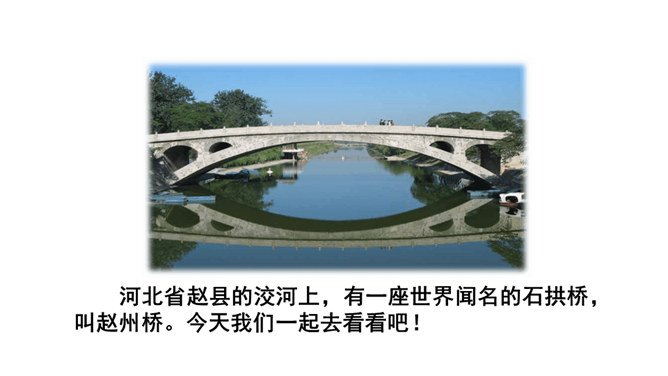 河北省赵县的洨河上,有一座世界闻名的石拱桥,叫赵州桥。今天我们一起去看看吧!1.请同学们自由朗读课文,努力读准字音、读通句子。2.想一想:课文写了什么?书写指导:土字下横要长、稍往上提,中间一竖与下边竖是两笔,人字撇短捺要长。书写指导:少字竖要短、左撇右点向外展、右点位置稍高、下撇要长,目字稍窄。书写指导:下框要窄、框内是两横,一长横封闭下框,厶起笔在横的中间、折收笔要轻。所属专题:赵州桥ppt。