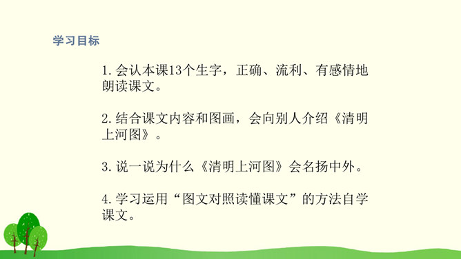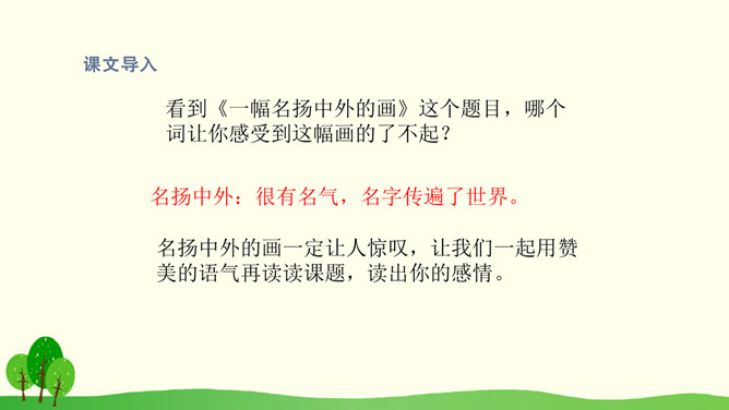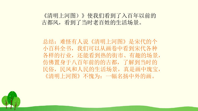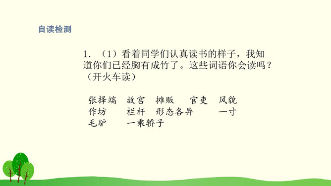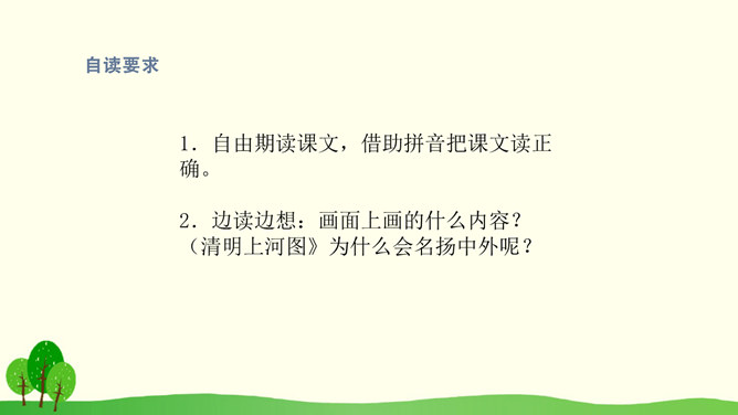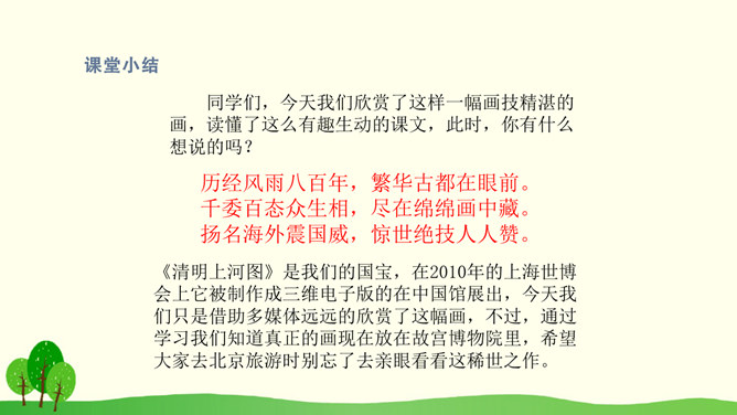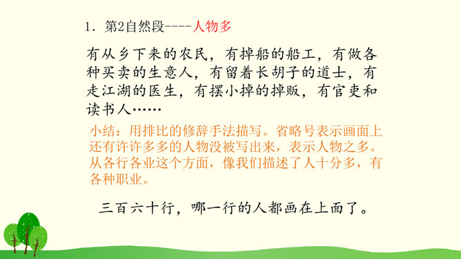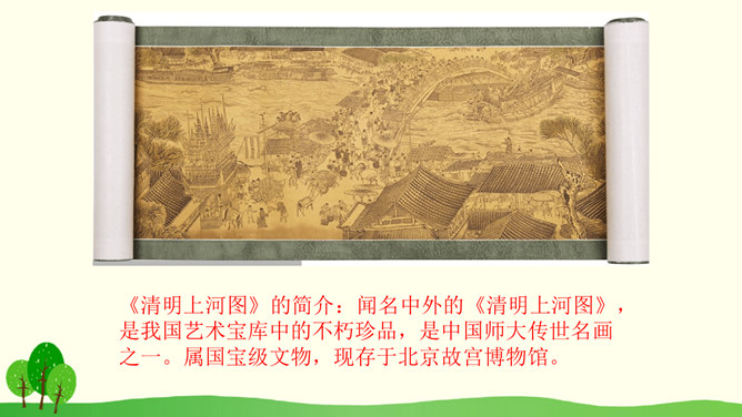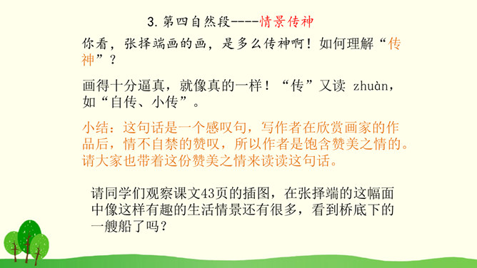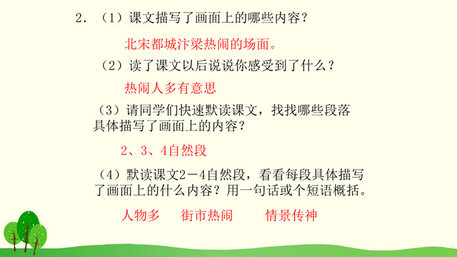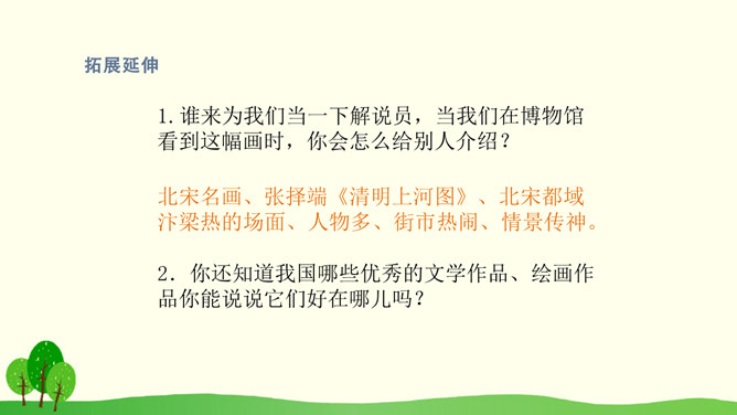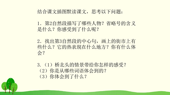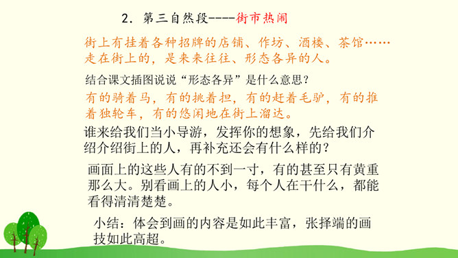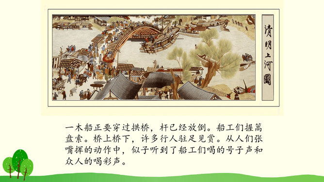 结合课文插图默读课文,思考以下问题:1.第2自然段描写了哪些人物?省略号的含义是什么?你感受到了什么呢?2.找出第3自然段的中心句,画上的街市上有些什么?它的热表現在什么地方?你有什么体会?3.(1)桥北头的情景带给你怎样的感受?(2)你是从哪些词语体会到的?(3)你体会到了什么?谁来给我们当小导游,发挥你的想象,先给我们介绍介绍街上的人,再补充还会有什么样的?所属专题:一幅名扬中外的画ppt。
