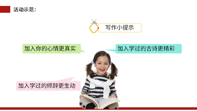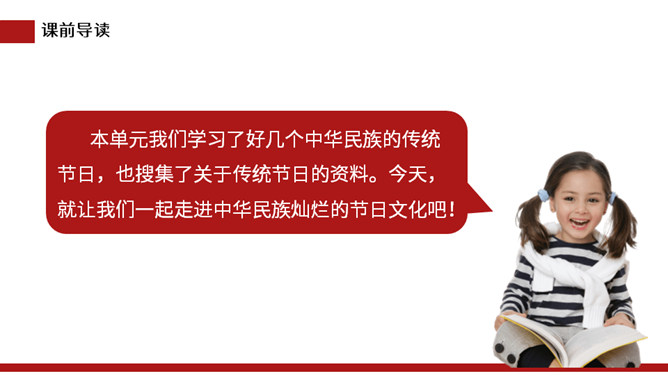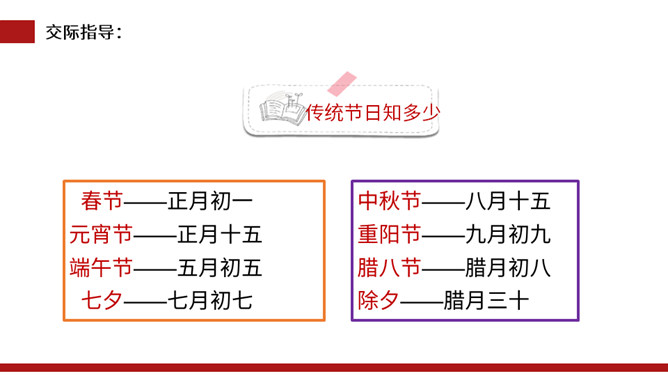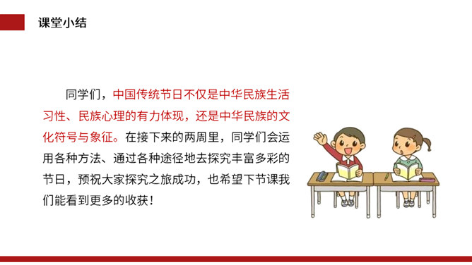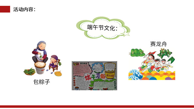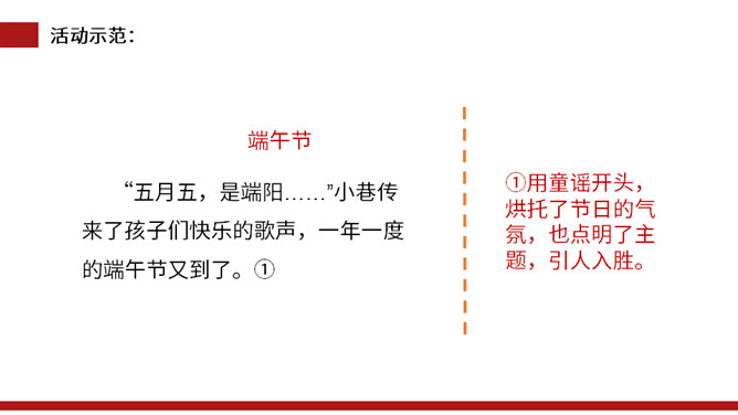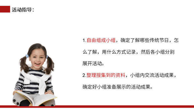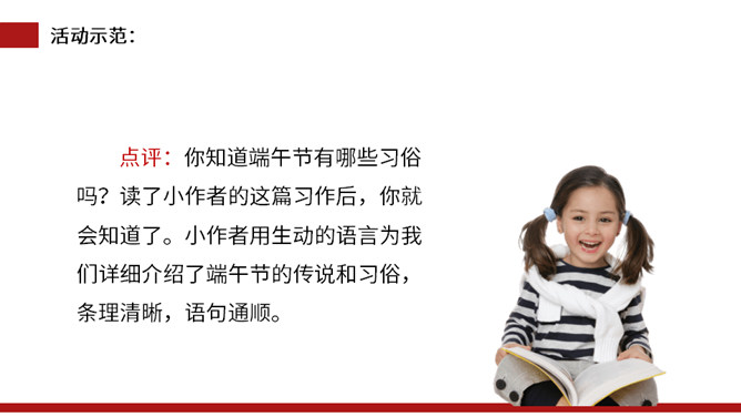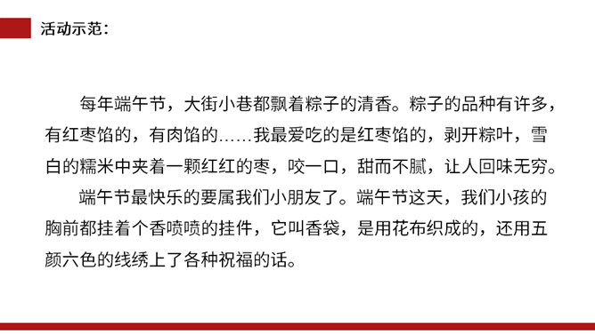 1.自由组成小组,确定了解哪些传统节日,怎么了解,用什么方式记录,然后各小组分别展开活动。2.整理搜集到的资料,小组内交流活动成果,确定好小组准备展示的活动成果。3.活动成果展示。全班同学互相评议、补充,评选出最佳成果展。4.根据活动内容,选一个传统节日,写一篇作文,可以写自己家过节的过程,也可以写节日中发生的印象深刻的故事。点评:你知道端午节有哪些习俗吗?读了小作者的这篇习作后,你就会知道了。所属专题:中华传统节日ppt。