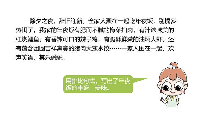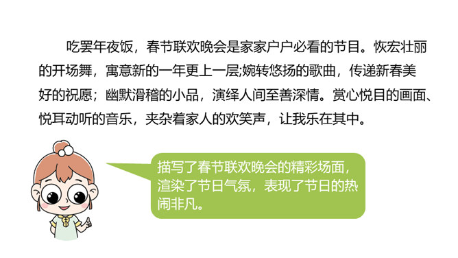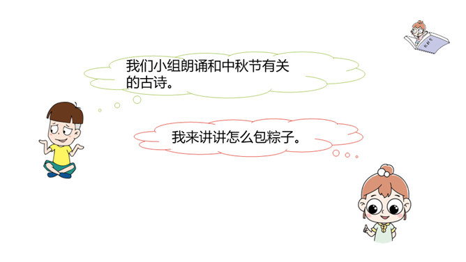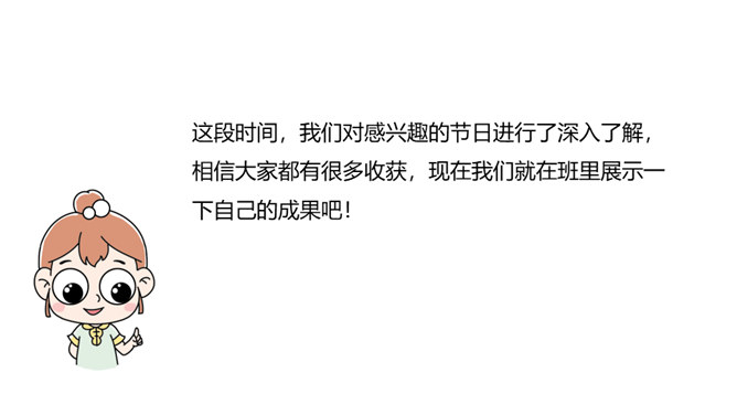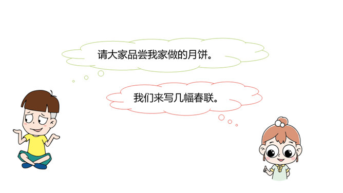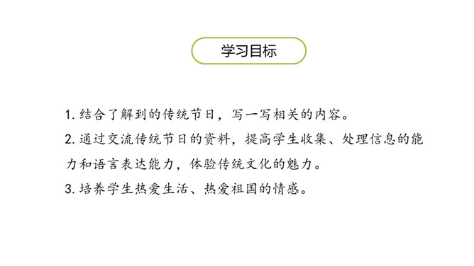 1.结合了解到的传统节日,写一写相关的内容。2.通过交流传统节日的资料,提高学生收集、处理信息的能力和语言表达能力,体验传统文化的魅力。3.培养学生热爱生活、热爱祖国的情感。这段时间,我们对感兴趣的节日进行了深入了解,相信大家都有很多收获,现在我们就在班里展示一下自己的成果吧!选一个传统节日,写一篇习作。可以写自己家过节的过程,也可以写节日中发生的印象深刻的故事。所属专题:中华传统节日ppt。