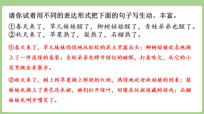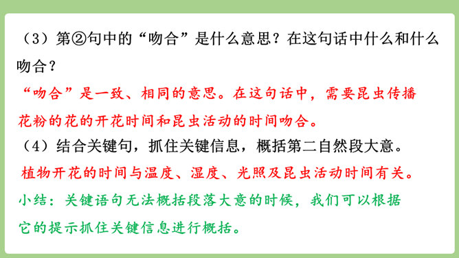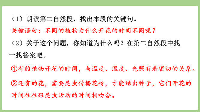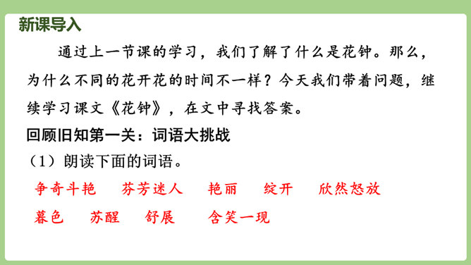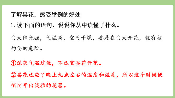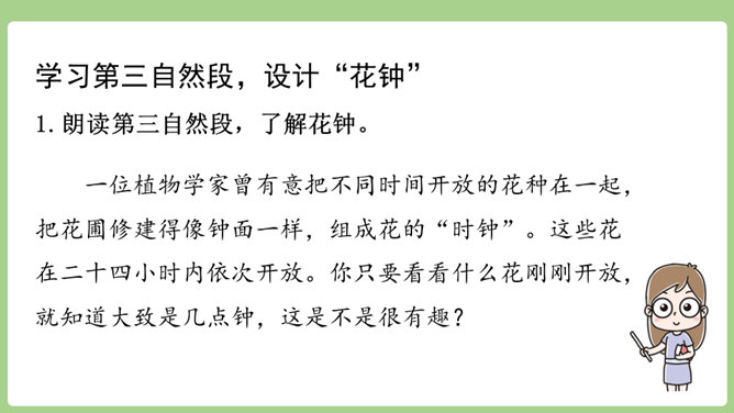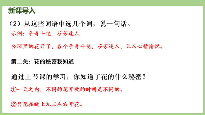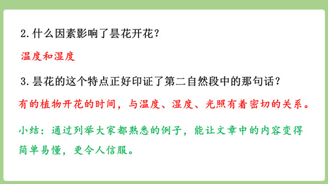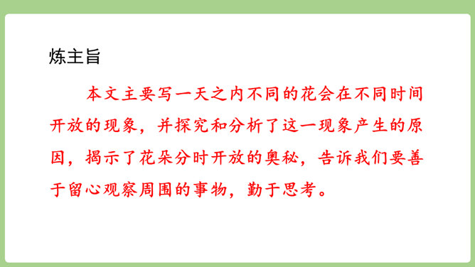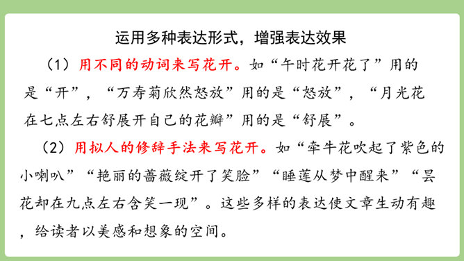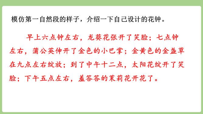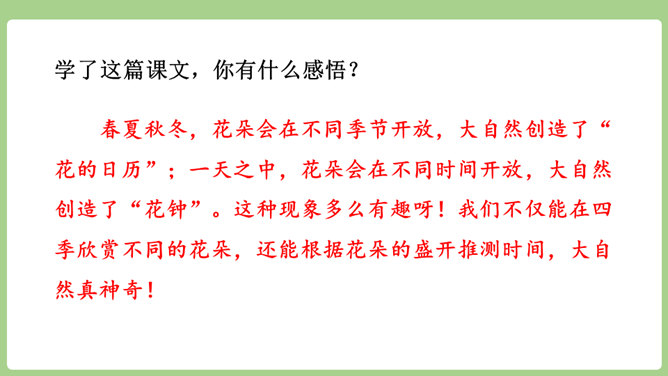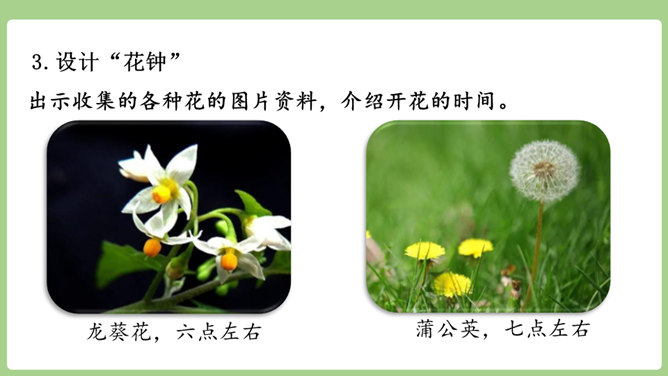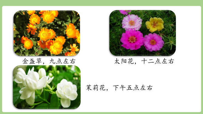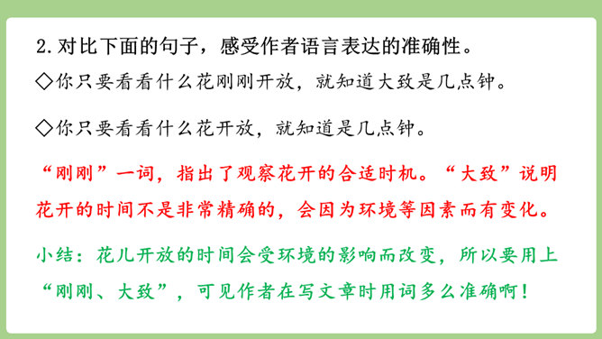 “刚刚”一词,指出了观察花开的合适时机。“大致”说明花开的时间不是非常精确的,会因为环境等因素而有变化。“刚刚”一词,指出了观察花开的合适时机。“大致”说明花开的时间不是非常精确的,会因为环境等因素而有变化。用不同的动词来写花开。如“午时花开花了”用的是“开”,“万寿菊欣然怒放”用的是“怒放”,“月光花在七点左右舒展开自己的花瓣”用的是“舒展”。拟人的修辞手法来写花开。如“牵牛花吹起了紫色的小喇叭”。所属专题:花钟ppt。