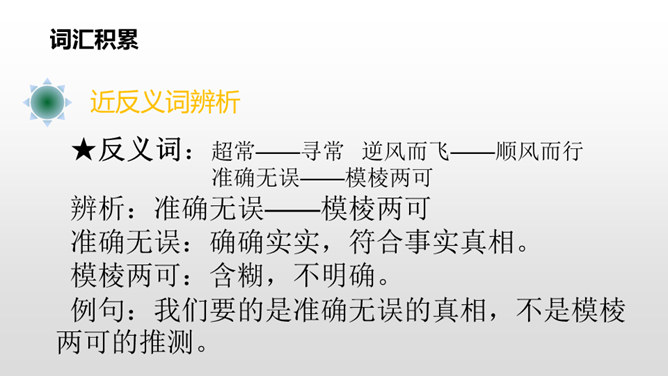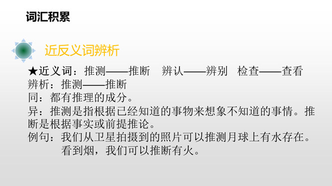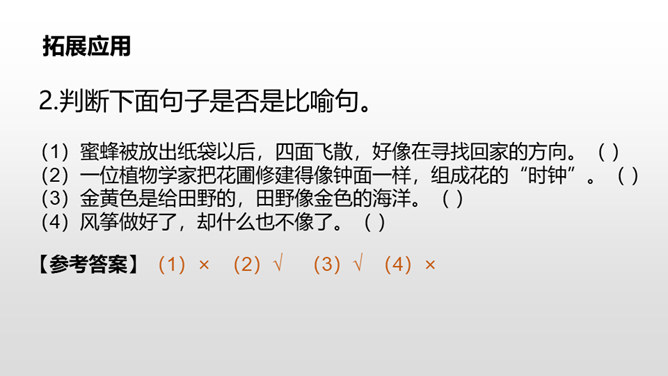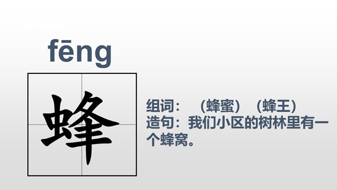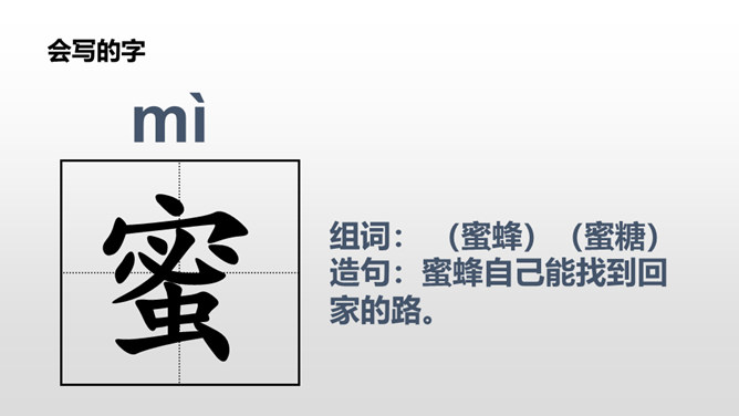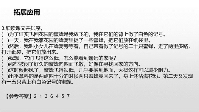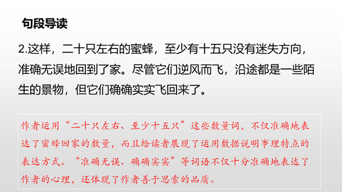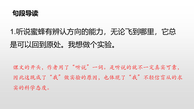 课文的开头,作者用了“听说”一词。是听说的就不一定真实可靠,因此这既成了“我”做实验的原因,也体现了“我”不轻信盲从的求实的科学态度。作者运用“二十只左右、至少十五只”这些数量词,不仅准确地表达了蜜蜂回家的数量,而且给读者展现了运用数据说明事理特点的表达方式。“准确无误、确确实实”等词语不仅十分准确地表达了作者的心理,还体现了作者善于思索的品质。所属专题:蜜蜂ppt。
