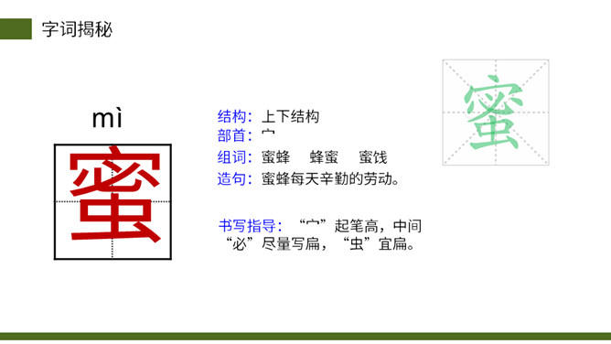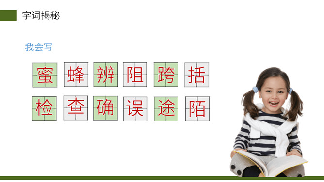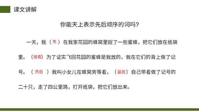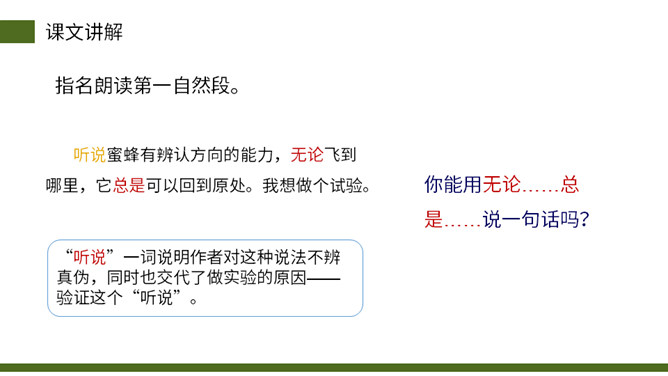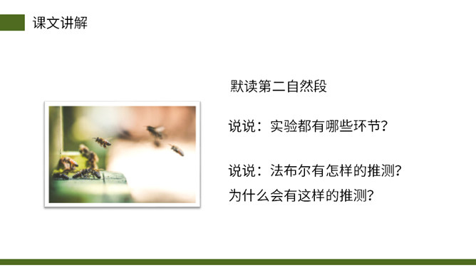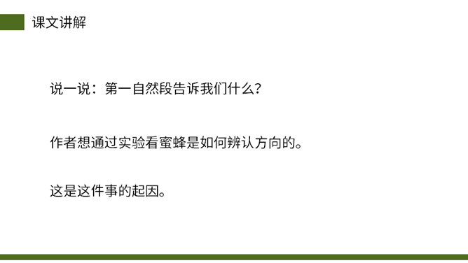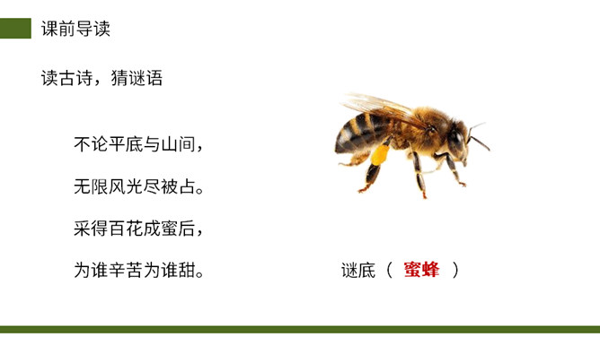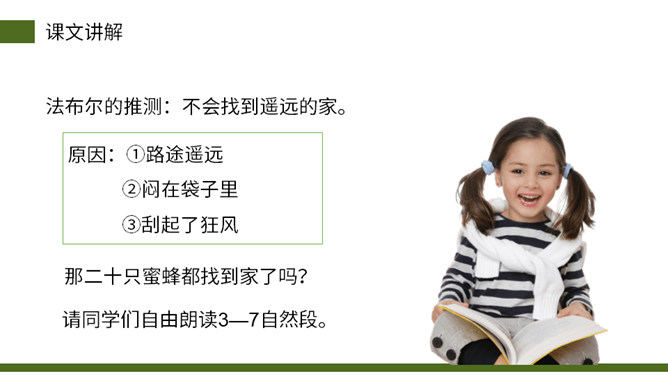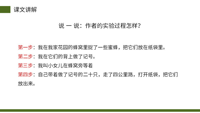 从小女儿的神态、动作、语言描写切入,与前文“我”的推测形成鲜明的对比,说明这个实验已经初见结论,可以初步判定蜜蜂具有辨别方向的能力。这句话说明蜜蜂飞行的速度快。“尽管”写出了两种不易飞回的的情况,然后用“但”一转,之处他们“确确实实”飞回来了,这正式了蜜蜂确实有辨别方向的能力。这几段写出了作者实验的结论——蜜蜂确实有辨别方向的能力。本文记录了作者为证实蜜蜂有辨别方向的能力而进行了一次实验的过程。所属专题:蜜蜂ppt。