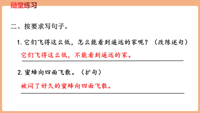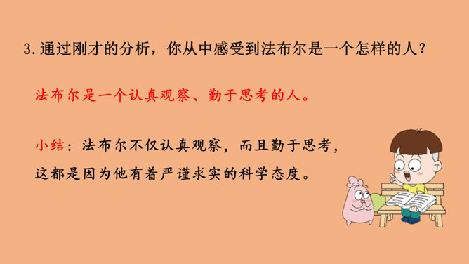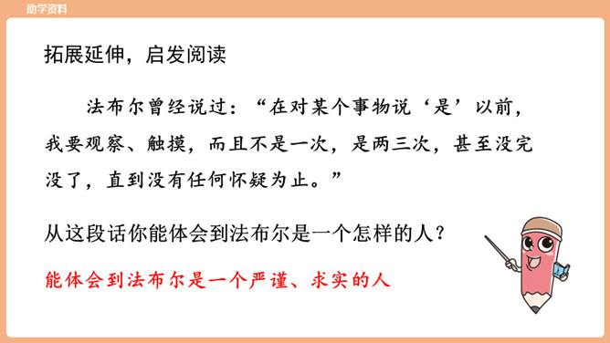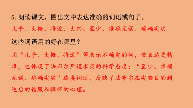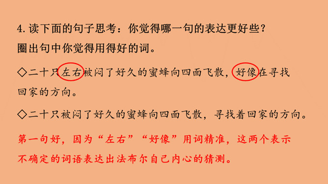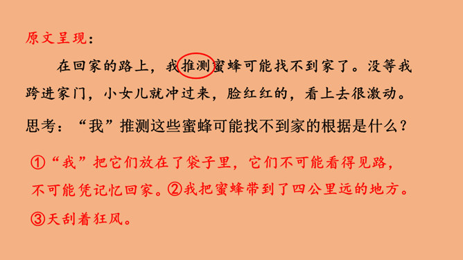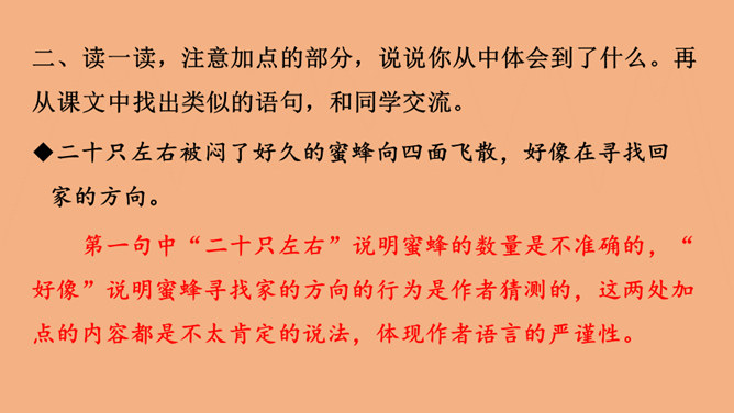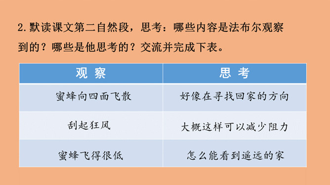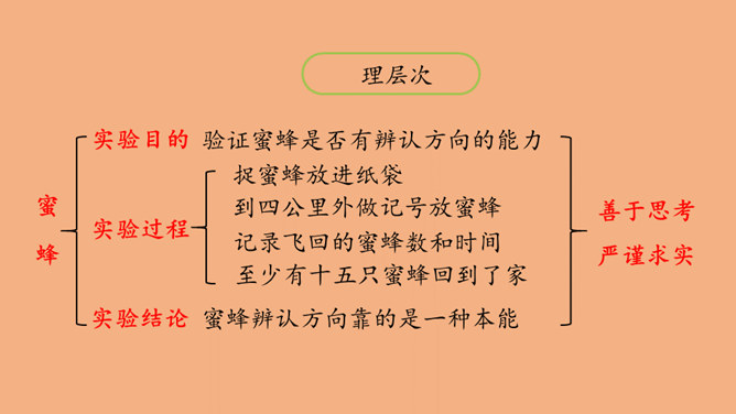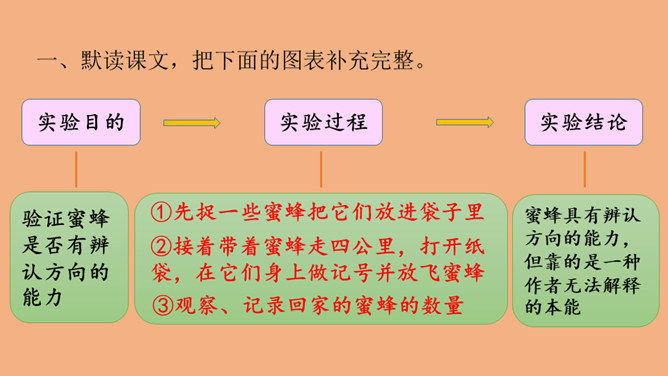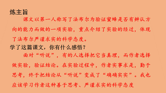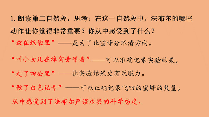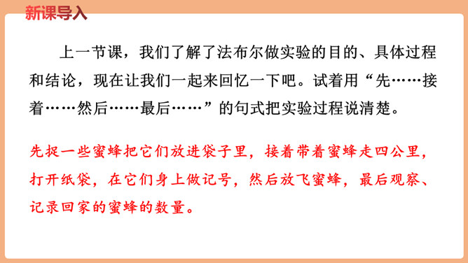上一节课,我们了解了法布尔做实验的目的、具体过程和结论,现在让我们一起来回忆一下吧。试着用“先……接着……然后……最后……”的句式把实验过程说清楚。先捉一些蜜蜂把它们放进袋子里,接着带着蜜蜂走四公里,打开纸袋,在它们身上做记号,然后放飞蜜蜂,最后观察、记录回家的蜜蜂的数量。朗读第二自然段,思考:在这一自然段中,法布尔的哪些动作让你觉得非常重要?你从中感受到了什么?所属专题:蜜蜂ppt。