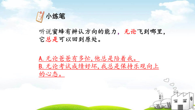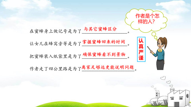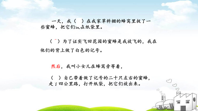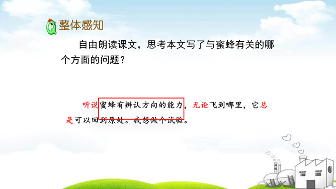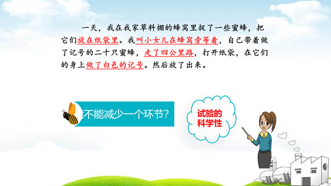 说一说:你从试验过程感受到什么?从试验的过程,我们感受到科学家求真务实的研究态度、严谨的科学作风和认真观察,用心思考的研究品质。体现作者观察得很仔细;体现了科普说明文用词的准确性。最后其它的蜜蜂的下落是怎么样的呢?细读第五、六自然段,找出答案。 说一说:学了这篇课文你有什么启示?我们要养成仔细观察,认真思考的的习惯。我们要学习科学家严谨的科学作风和求真务实的科学态度。所属专题:蜜蜂ppt。