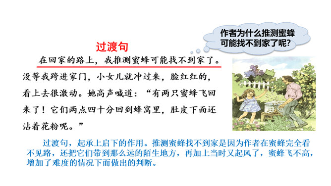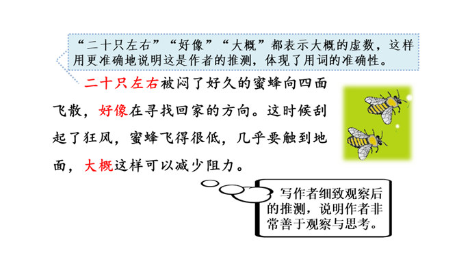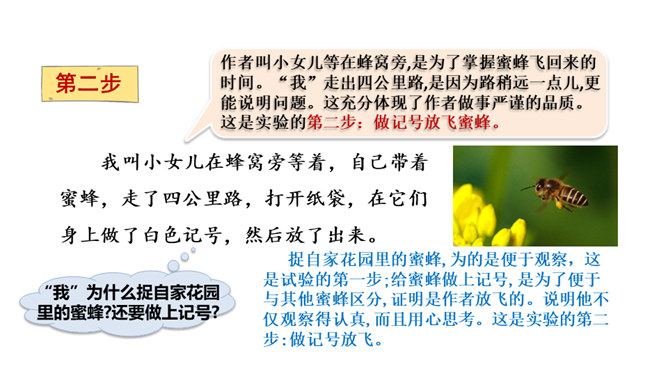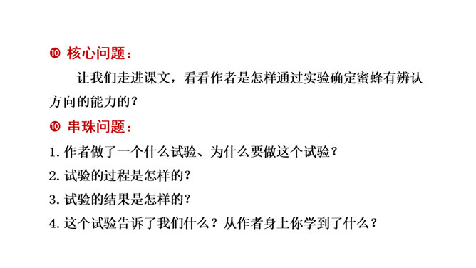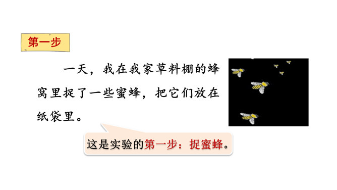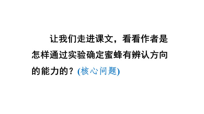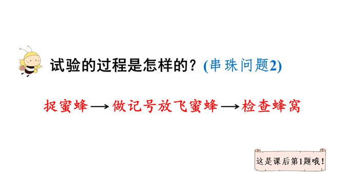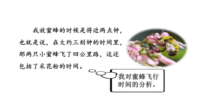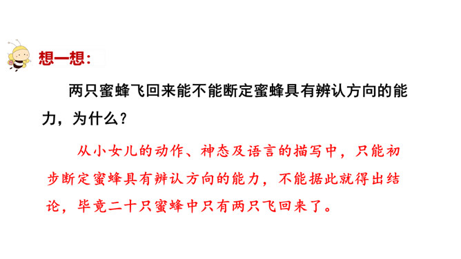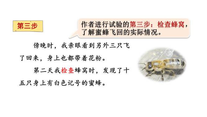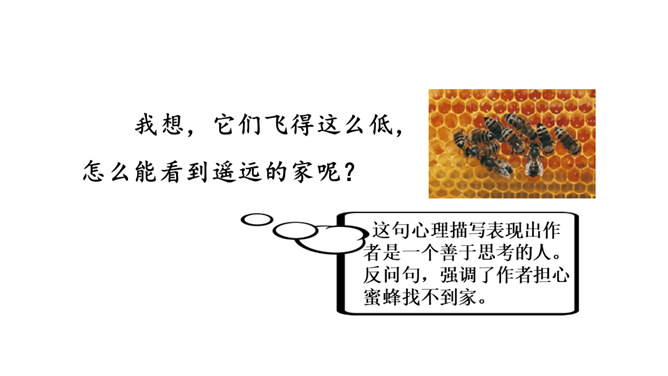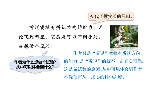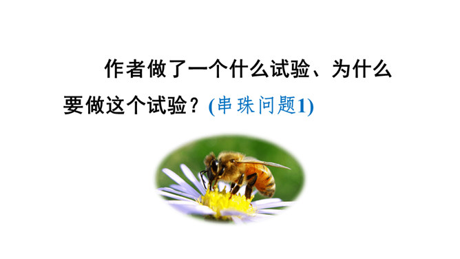 作者得出明确的结论了吗?读课后“资料袋”,然后讨论,你从作者身上学习到什么?作者试验得出的结论有明确肯定的地方(不是超常的记忆力),也有模糊存疑的地方(我无法解释的本能)。这不奇怪,科学史上这种现象很多。我们学习这篇课文,重要的不是要找到一个明确肯定的答案,而是要学习作者渗透在试验过程中的探究精神。作者坦然说出自己无法解释的结论,更进一步说明他是一个严肃对待科学、实事求是的人。所属专题:蜜蜂ppt。
