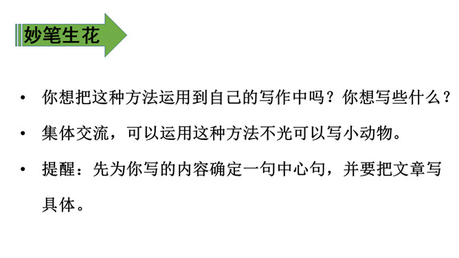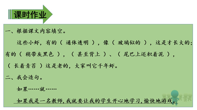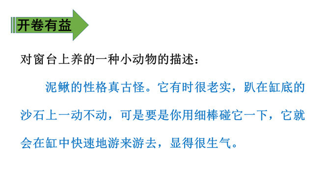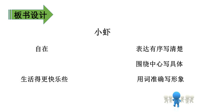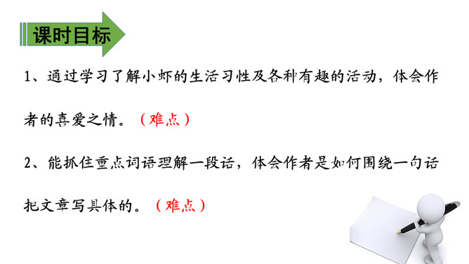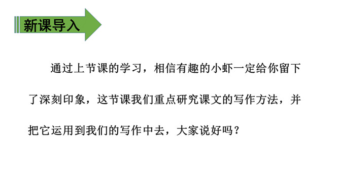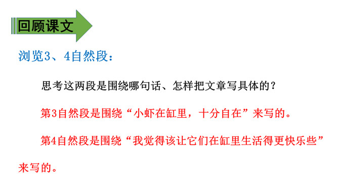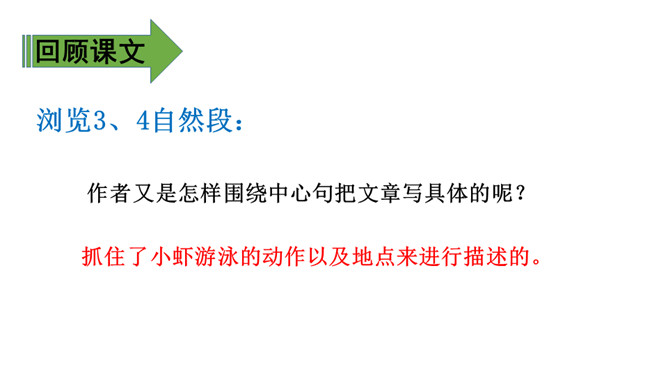 1、通过学习了解小虾的生活习性及各种有趣的活动,体会作者的喜爱之情。(难点)2、能抓住重点词语理解一段话,体会作者是如何围绕一句话把文章写具体的。(难点)通过上节课的学习,相信有趣的小虾一定给你留下了深刻印象,这节课我们重点研究课文的写作方法,并把它运用到我们的写作中去,大家说好吗?浏览3、4自然段:思考这两段是围绕哪句话、怎样把文章写具体的?第3自然段是围绕“小虾在缸里,十分自在”来写的。所属专题:小虾ppt。