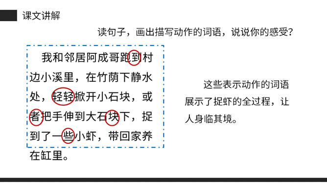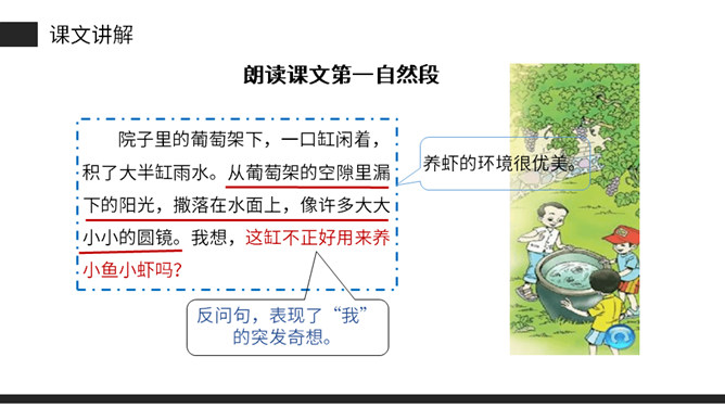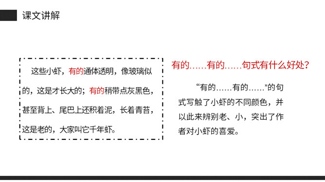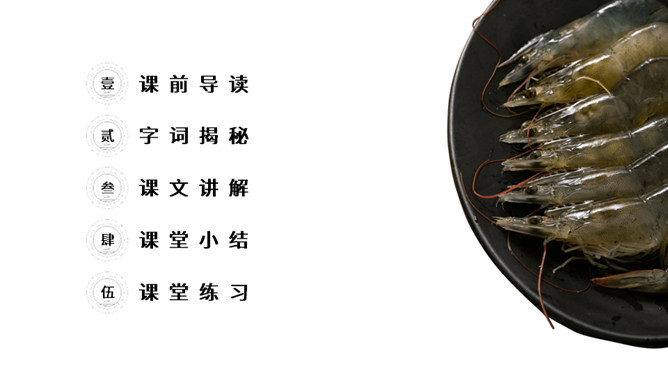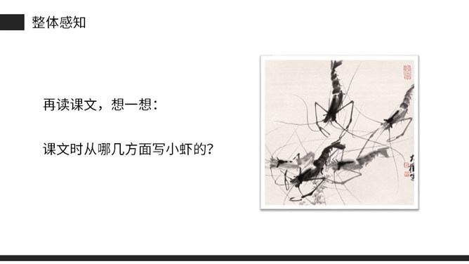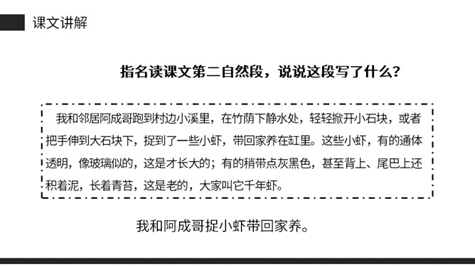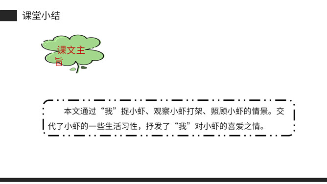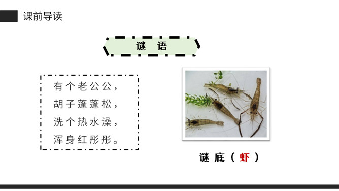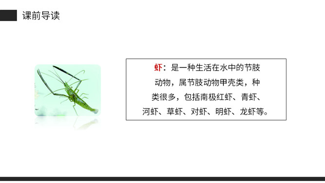 思考:课文是从哪几方面描写小虾的?本文通过“我”捉小虾、观察小虾打架、照顾小虾的情景。交代了小虾的一些生活习性,抒发了“我”对小虾的喜爱之情。(1)不认识的字可以看拼音,或者请教老师和同学。(2)读准每一个字的字音,圈出生字词;(3)读通每个句子,读不通顺的多读几遍;(4)给每个自然段写上序号。再读课文,想一想:课文时从哪几方面写小虾的?指名读课文第二自然段,说说这段写了什么?所属专题:小虾ppt。