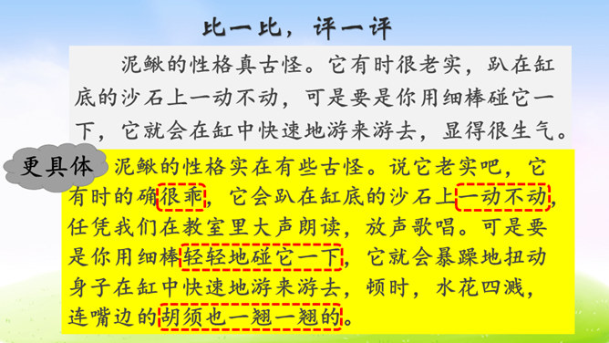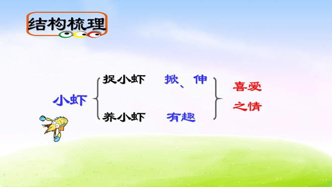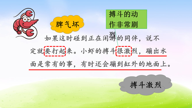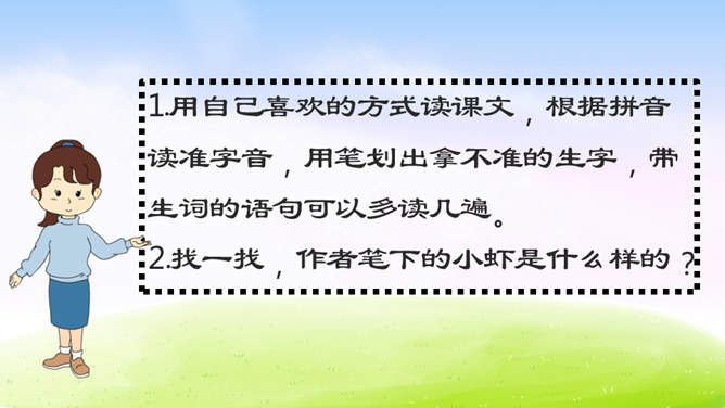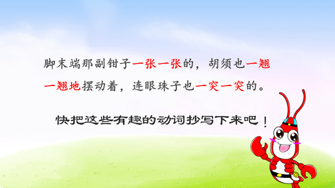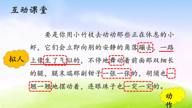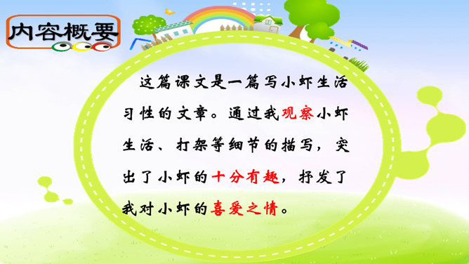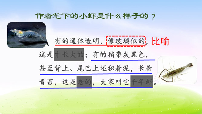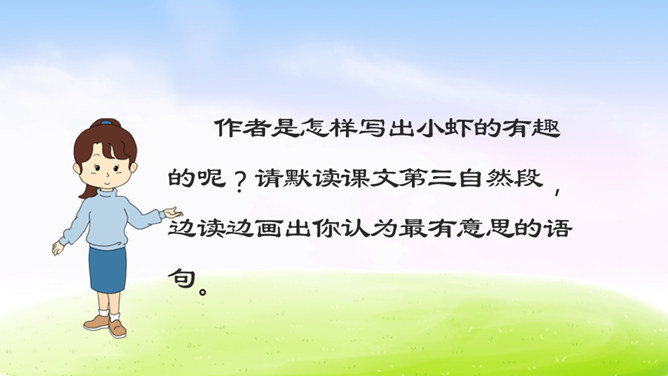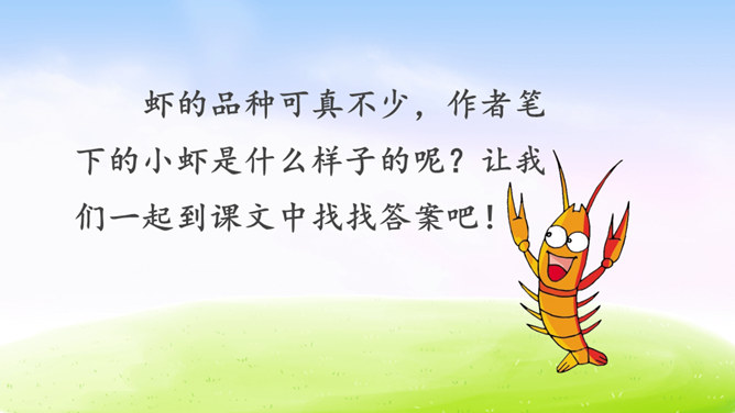 虾的品种可真不少,作者笔下的小虾是什么样子的呢?让我们一起到课文中找找答案吧!1.用自己喜欢的方式读课文,根据拼音读准字音,用笔划出拿不准的生字,带生词的语句可以多读几遍。2.找一找,作者笔下的小虾是什么样的?默读课文,边读边想:作者笔下的小虾有什么特点?作者是怎样写出小虾的有趣的呢?请默读课文第三自然段,边读边画出你认为最有意思的语句。后面小虾的动作描写都是围绕小虾的有趣来写。所属专题:小虾ppt。