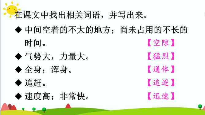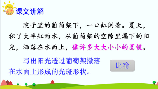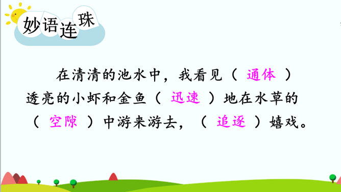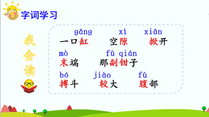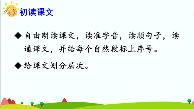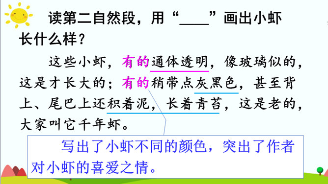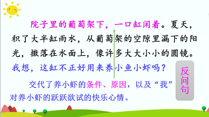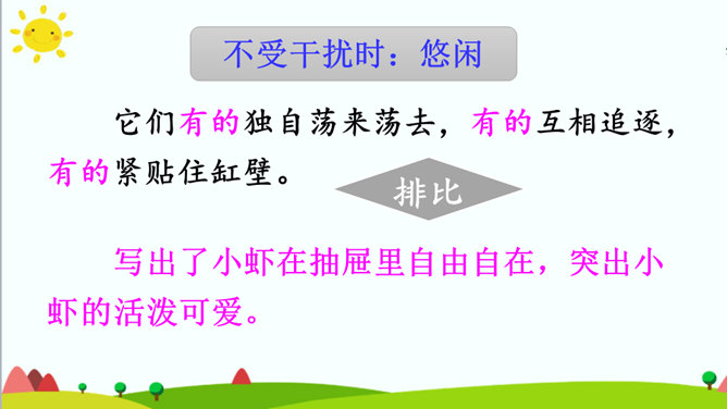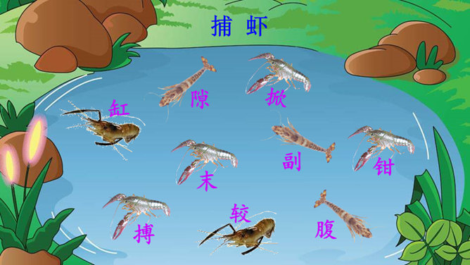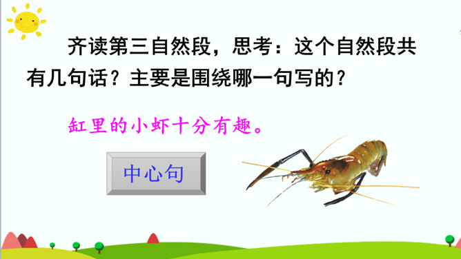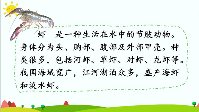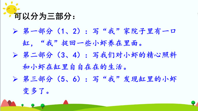 自由朗读课文,读准字音,读顺句子,读通课文,并给每个自然段标上序号。给课文划分层次。可以分为三部分:第一部分(1、2):写“我”家院子里有一口缸,“我”捉回一些小虾养在里面。第二部分(3、4):写我们对小虾的精心照料和小虾在缸里自自在在的生活。第三部分(5、6):写“我”发现缸里的小虾变多了。写出阳光透过葡萄架撒落在水面上形成的光斑形状。交代了养小虾的条件、原因,以及“我”对养小虾的跃跃欲试的快乐心情。所属专题:小虾ppt。