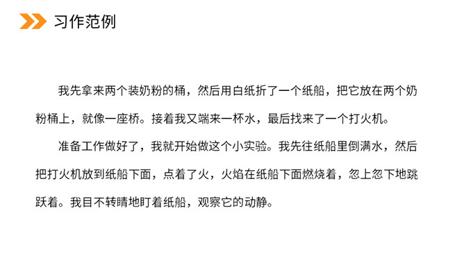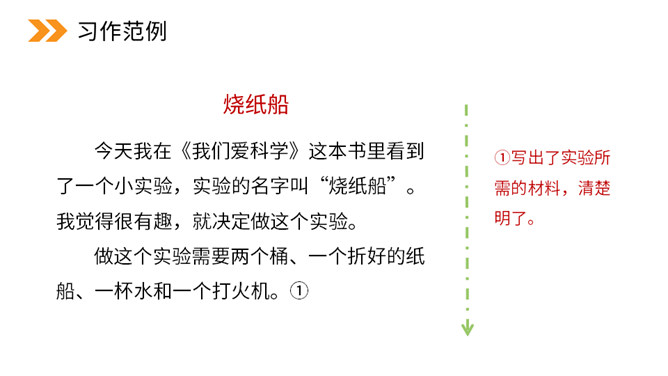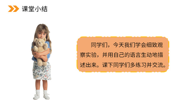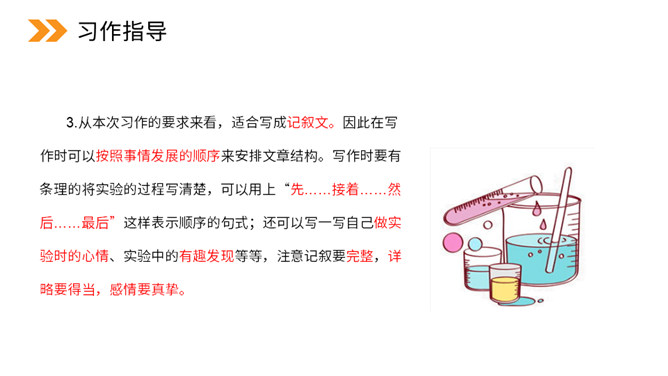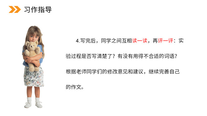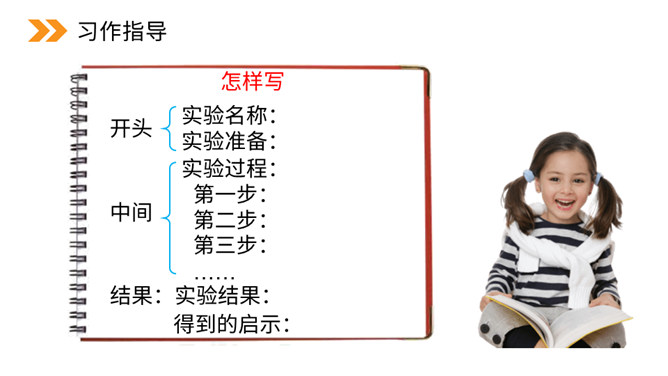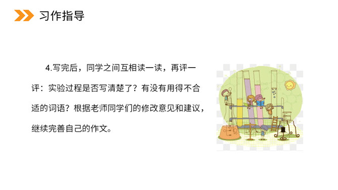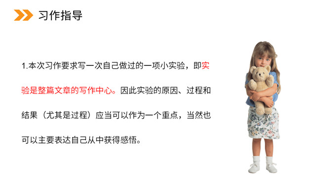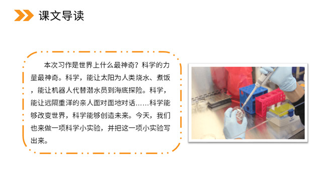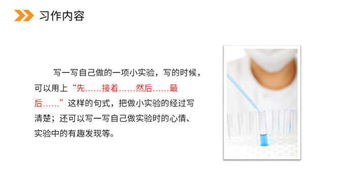 本次习作是世界上什么最神奇?科学的力量最神奇。科学,能让太阳为人类烧水、煮饭,能让机器人代替潜水员到海底探险。科学,能让远隔重洋的亲人面对面地对话……科学能够改变世界,科学能够创造未来。今天,我们也来做一项科学小实验,并把这一项小实验写出来。本次习作要求写一次自己做过的一项小实验,即实验是整篇文章的写作中心。因此实验的原因、过程和结果(尤其是过程)应当可以作为一个重点。所属专题:我做了一项小实验ppt。