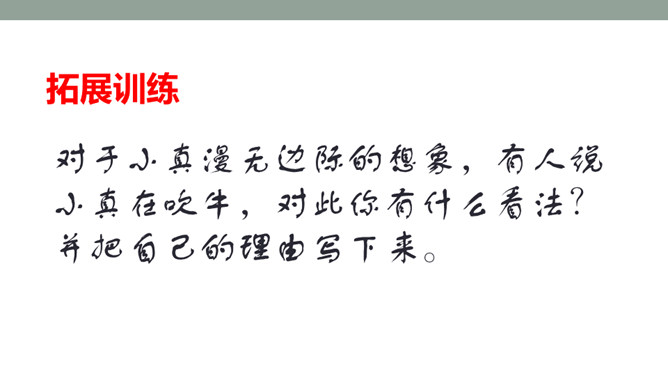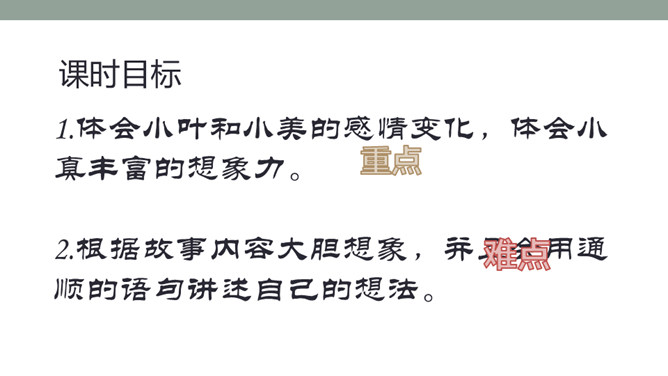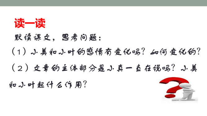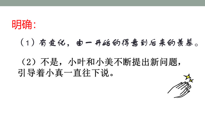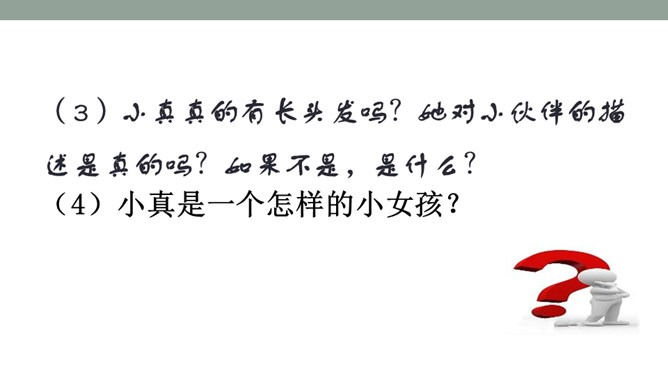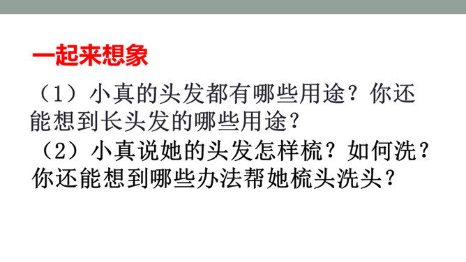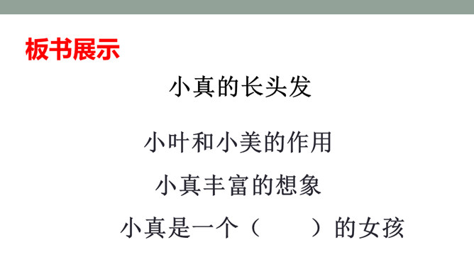 1.体会小叶和小美的感情变化,体会小真丰富的想象力。2.根据故事内容大胆想象,并且会用通顺的语句讲述自己的想法。默读课文,思考问题: 1)小美和小叶的感情有变化吗?如何变化的?(2)文章的主体部分是小真一直在说吗?小美和小叶起什么作用?3)小真真的有长头发吗?她对小伙伴的描述是真的吗?如果不是,是什么?(4)小真是一个怎样的小女孩?有变化,由一开始的得意到后来的羡慕。所属专题:小真的长头发ppt。