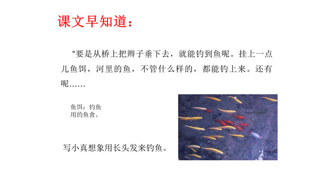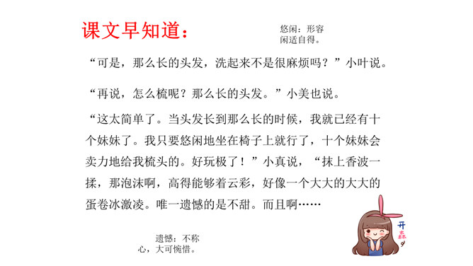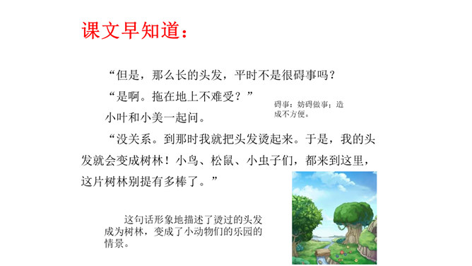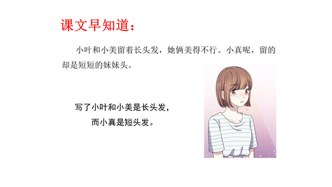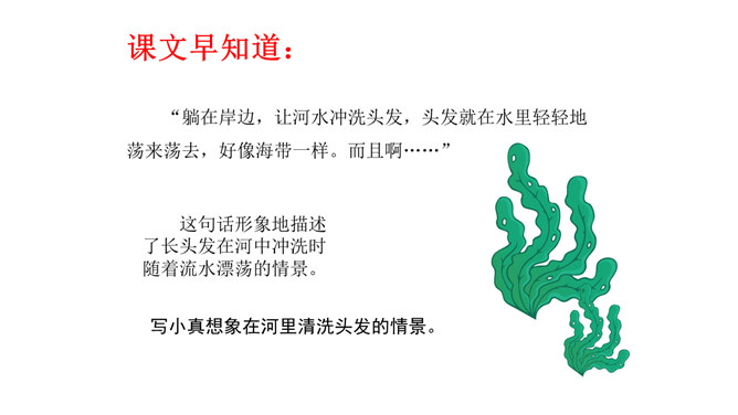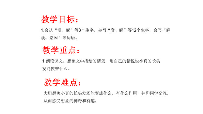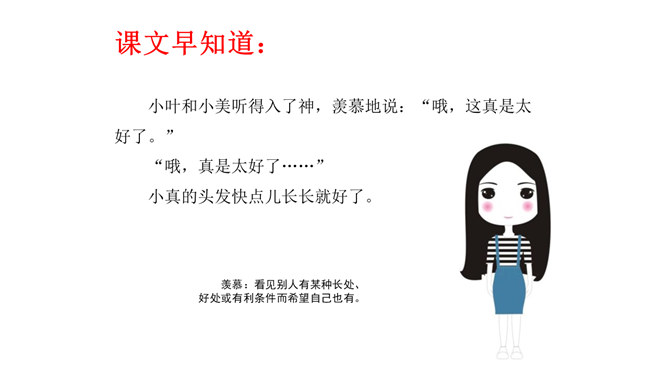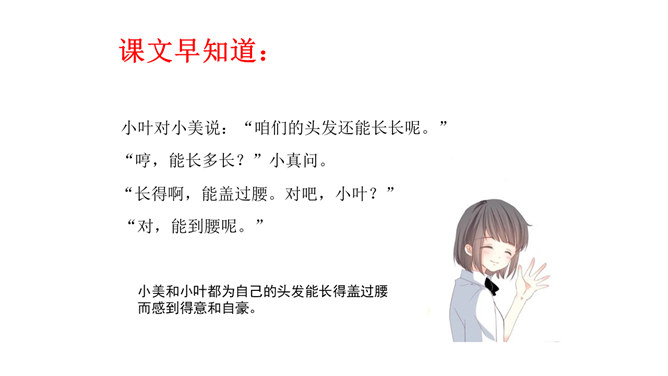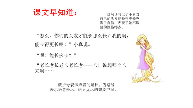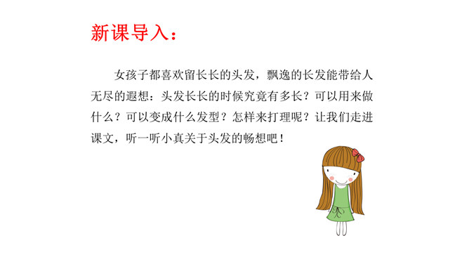 教学重点:1.朗读课文,想象文中描绘的情景,用自己的话说说小真的长头发能做些什么。教学目标:1.会认“栅、麻”等8个生字,会写“套、麻”等12个生字,会写“麻烦、悠闲”等词语。教学难点:大胆想象小真的长头发还能变成什么,有什么作用,并和同学交流,从而感受想象的神奇和有趣。女孩子都喜欢留长长的头发,飘逸的长发能带给人无尽的遐想:头发长长的时候究竟有多长?可以用来做什么?可以变成什么发型?所属专题:小真的长头发ppt。