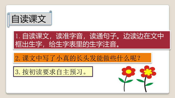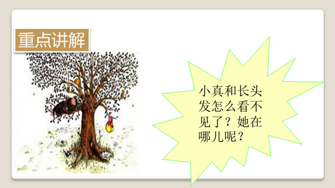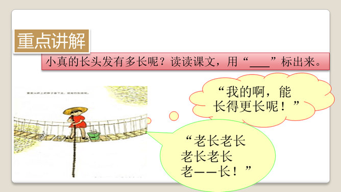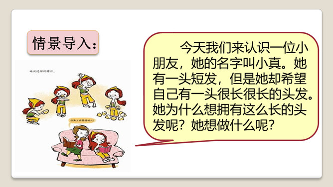 1.自读课文,读准字音,读通句子。边读边在文中框出生字,给生字表里的生字注音。2.课文中写了小真的长头发能做些什么呢? 3.按初读要求自主预习。今天我们来认识一位小朋友,她的名字叫小真。她有一头短发,但是她却希望自己有一头很长很长的头发。她为什么想拥有这么长的头发呢?她想做什么呢?是由日本绘本绘画家高楼方子创作的,被绘本之父松居直看中并编辑到这一套趣味绘本丛书中。所属专题:小真的长头发ppt。