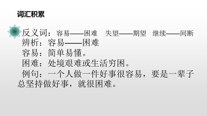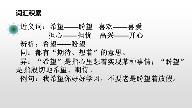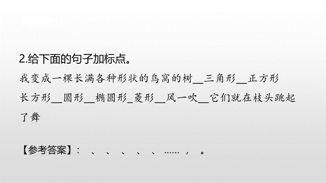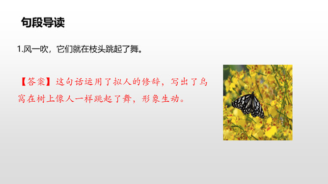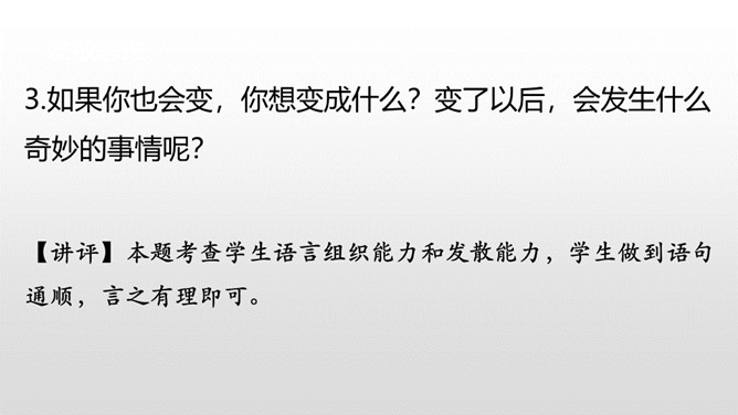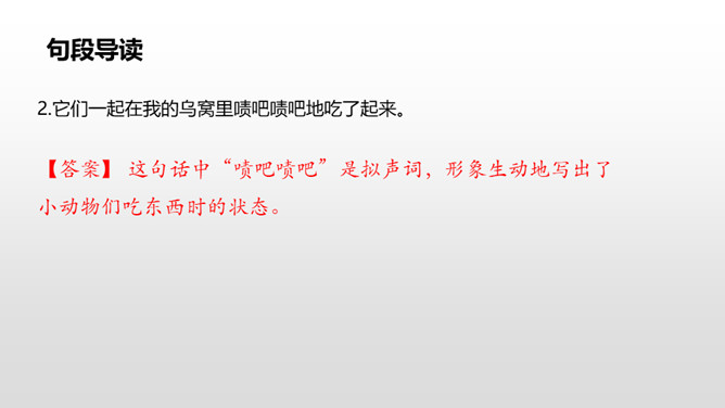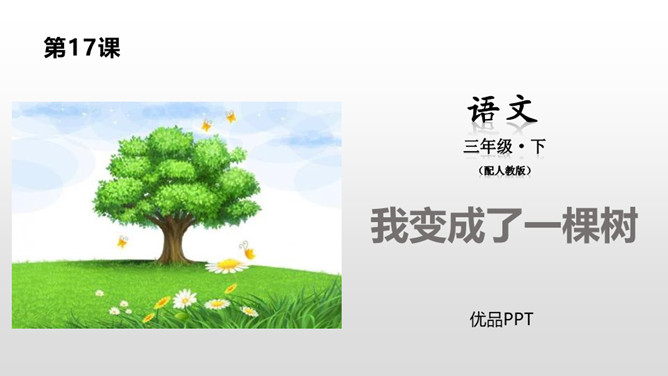 1.学生自由朗读课文。提出要求:第一,借助拼音把课文读正确,注意标点的停顿。第二,自学课文中的生字,读准音,记住字形,意思不明白的字词可以提出来。第三,标出自然段。2.指名分自然段读课文。这句话运用了拟人的修辞,写出了鸟窝在树上像人一样跳起了舞,形象生动。这句话中“啧吧啧吧”是拟声词,形象生动地写出了小动物们吃东西时的状态。如果你也会变,你想变成什么?变了以后,会发生什么奇妙的事情呢。所属专题:我变成了一棵树ppt。