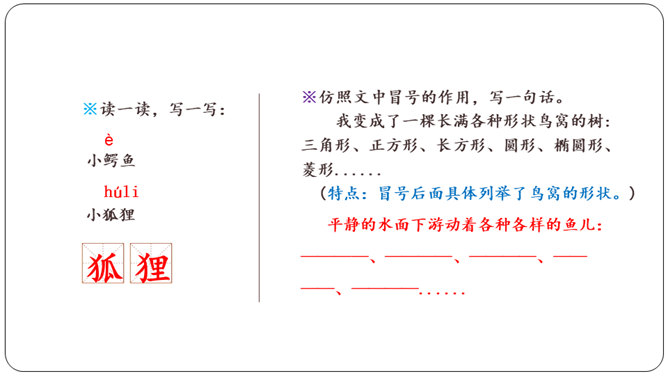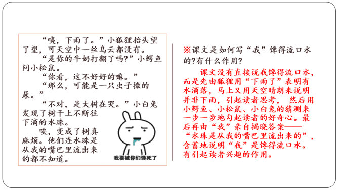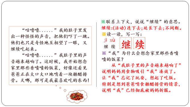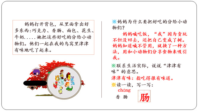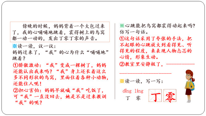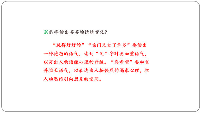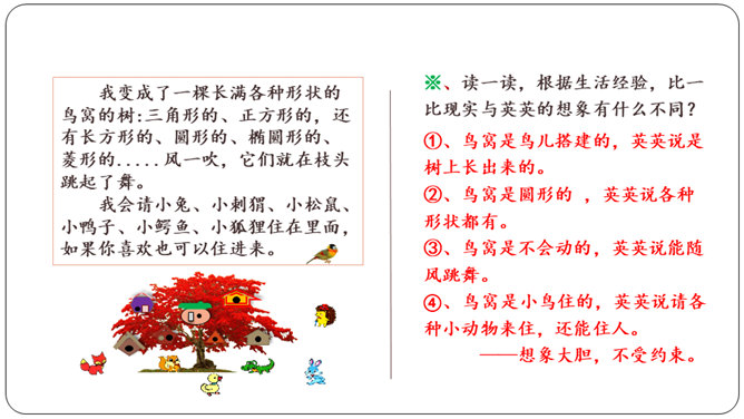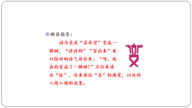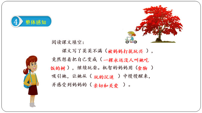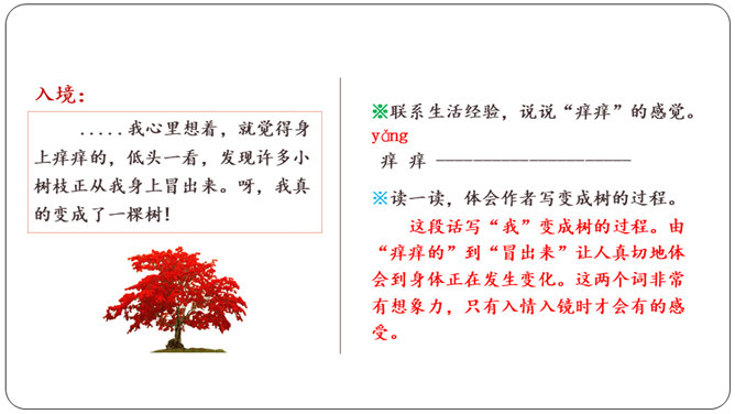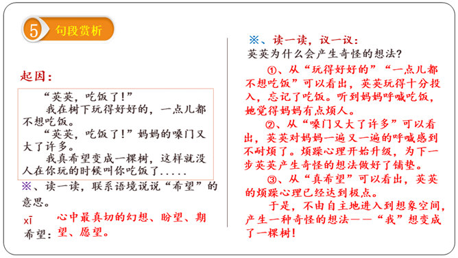 ①、从“玩得好好的”“一点儿都不想吃饭”可以看出,英英玩得十分投入,忘记了吃饭。听到妈妈呼喊吃饭,她觉得妈妈有点烦人。 ②、从“嗓门又大了许多”可以看出,英英对妈妈一遍又一遍的呼喊感到不耐烦了。烦躁心理开始升级,为下一步英英产生奇怪的想法做好了铺垫。③、从“真希望”可以看出,英英的烦躁心理已经达到极点。于是,不由自主地进入到想象空间,产生一种奇怪的想法--“我”想变成了一棵树!所属专题:我变成了一棵树ppt。