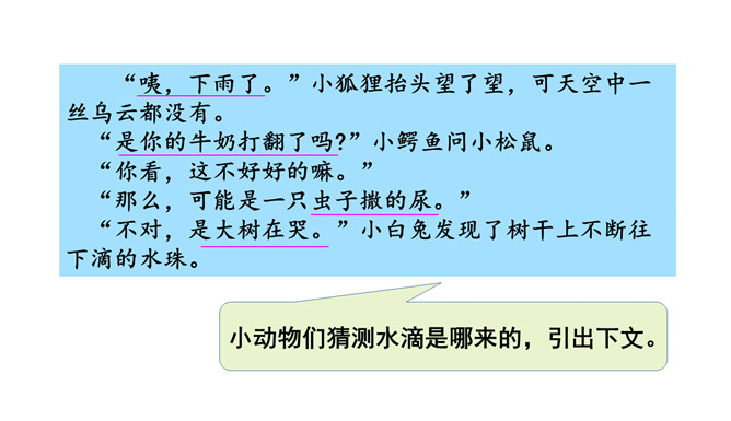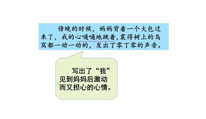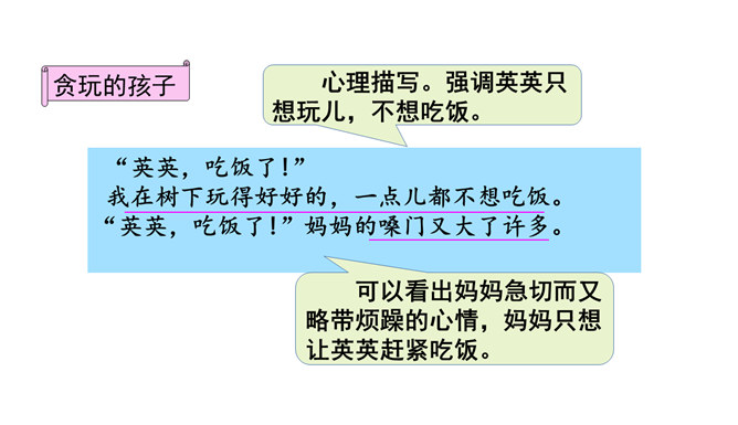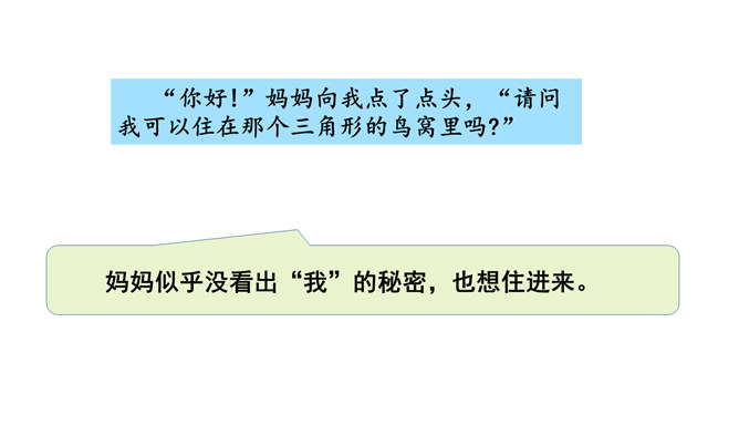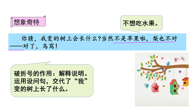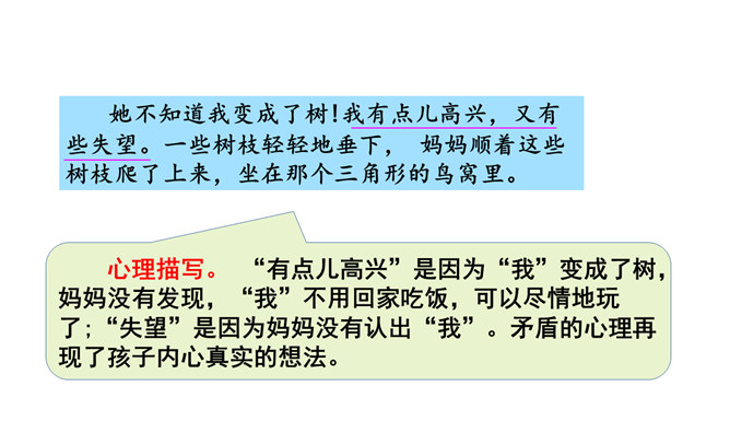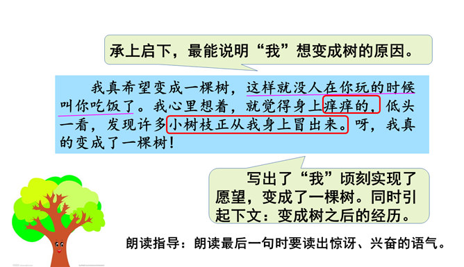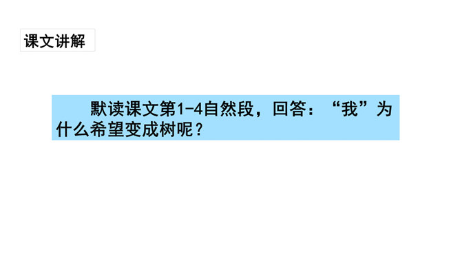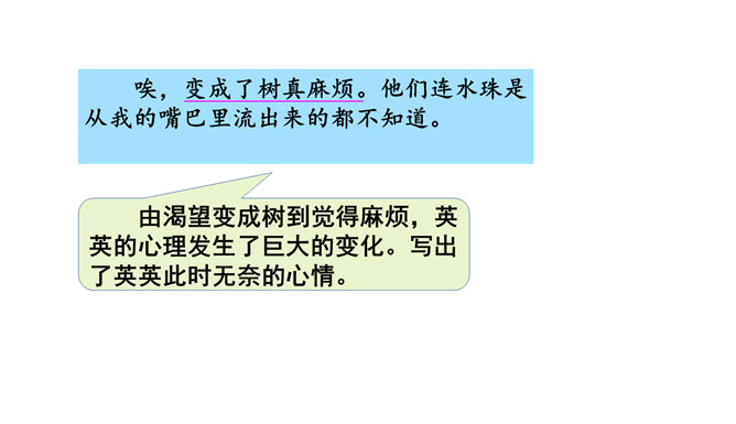默读课文第1-4自然段,回答:“我”为什么希望变成树呢?心理描写。强调英英只想玩儿,不想吃饭。可以看出妈妈急切而又略带烦躁的心情,妈妈只想让英英赶紧吃饭。承上启下,最能说明“我”想变成树的原因。写出了“我”顷刻实现了愿望,变成了一棵树。同时引起下文:变成树之后的经历。朗读指导:朗读最后一句时要读出惊讶、兴奋的语气。 默读课文第5-8自然段,说说“我”变成的树的样子和“我”的做法。所属专题:我变成了一棵树ppt。