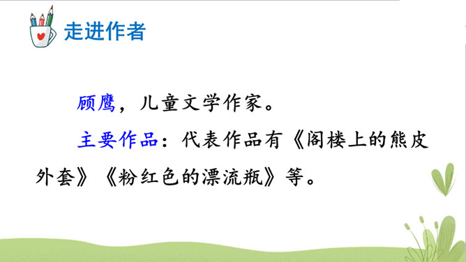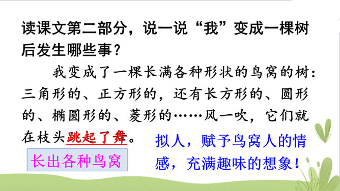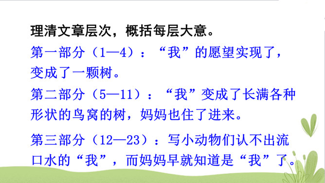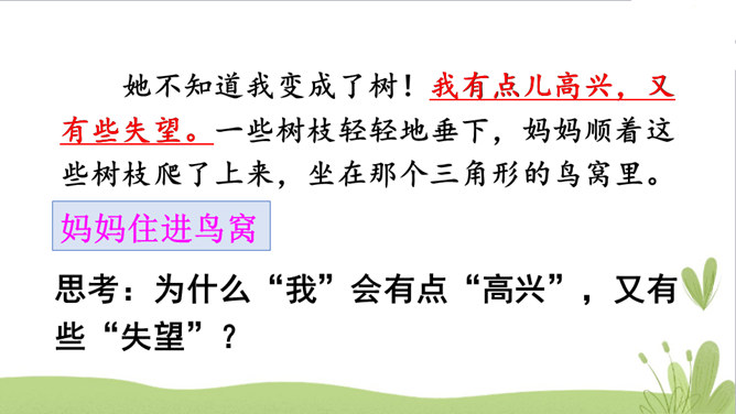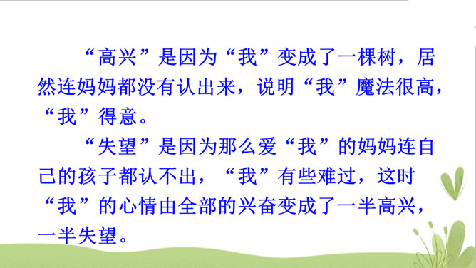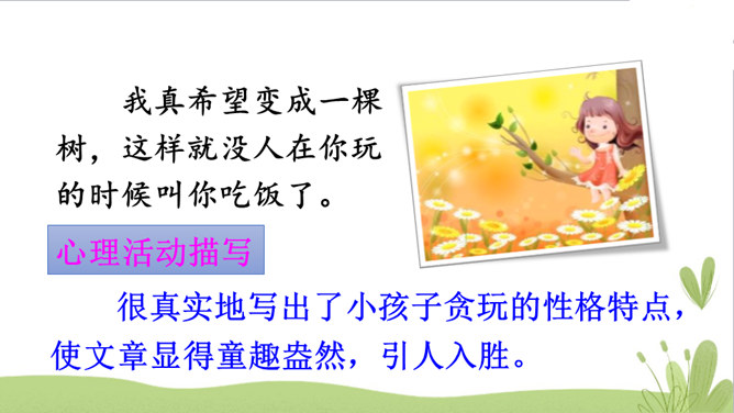 无论我们走多远,都走不出母亲的视线,因为母亲的心总是伴随着自己的孩子前行!我们要好好珍惜这伟大的母爱,学会感恩,学会报答。思考:问句结尾有什么好处?问句结尾,能引发读者的思考,使文章韵味无穷。思考:这句话在文章中的作用是什么?你如何理解其含义?这句话点明了文章的中心,世界上最了解孩子的人永远是母亲。在母亲眼里,每一个孩子都是不会被错认的天使。所属专题:我变成了一棵树ppt。