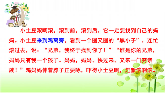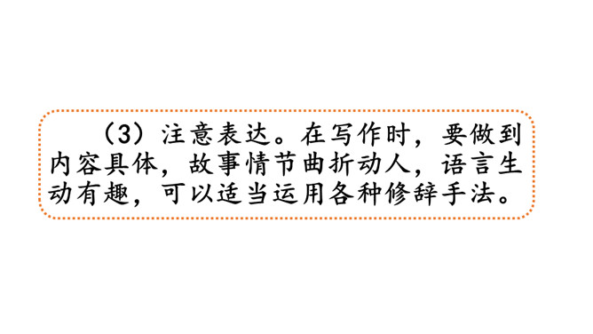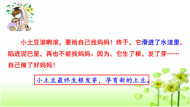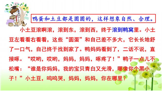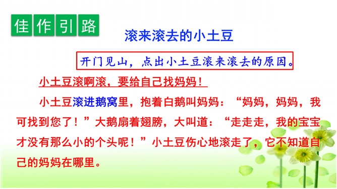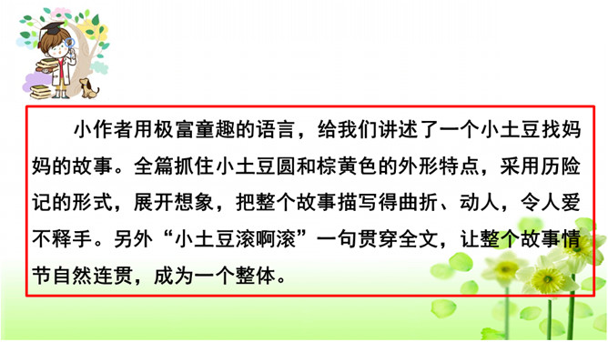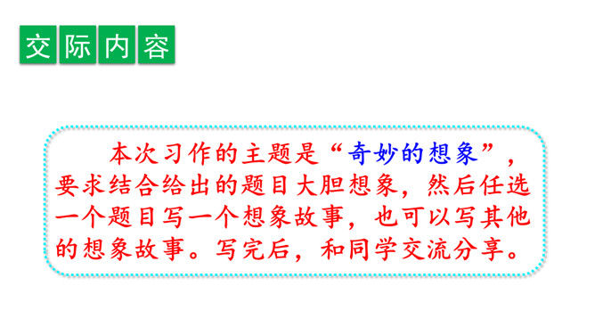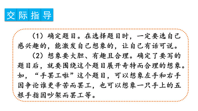 确定题目。在选择题目时,一定要选自己感兴趣的,能激发自己想象的,让自己有话可说。想象要大胆、有趣且合理。小作者用极富童趣的语言,给我们讲述了一个小土豆找妈妈的故事。全篇抓住小土豆圆和棕黄色的外形特点,采用历险记的形式,展开想象,把整个故事描写得曲折、动人,令人爱不释手。另外“小土豆滚啊滚”一句贯穿全文,让整个故事情节自然连贯,成为一个整体。所属专题:奇妙的想象ppt。