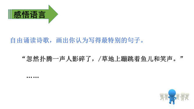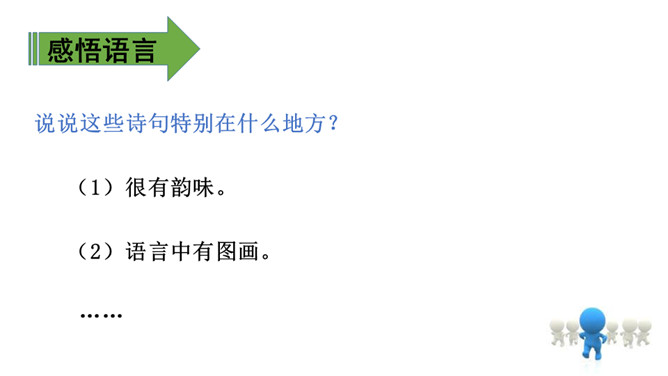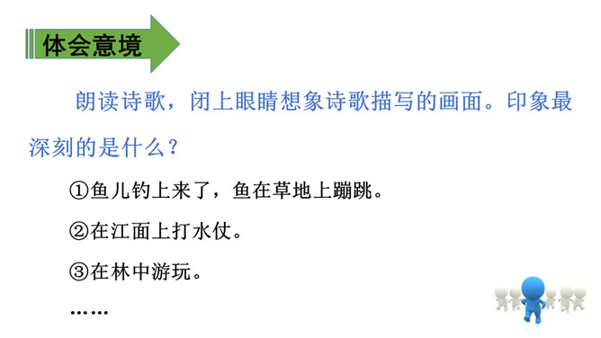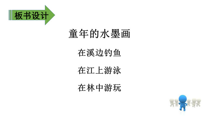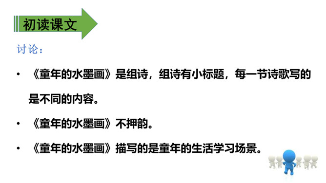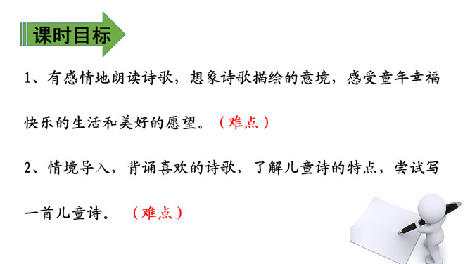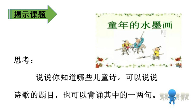 1、有感情地朗读诗歌,想象诗歌描绘的意境,感受童年幸福快乐的生活和美好的愿望。(难点)2、情境导入,背诵喜欢的诗歌,了解儿童诗的特点,尝试写一首儿童诗。 (难点)思考:说说你知道哪些儿童诗。可以说说诗歌的题目,也可以背诵其中的一两句。自由朗读课文,整体把握课文内容。用自己喜欢的方式来通读全文。你可以一个人读,可以找同桌读,要求边读边想一想课文的主要内容是什么。所属专题:童年的水墨画ppt。