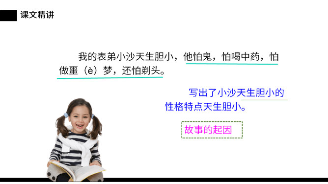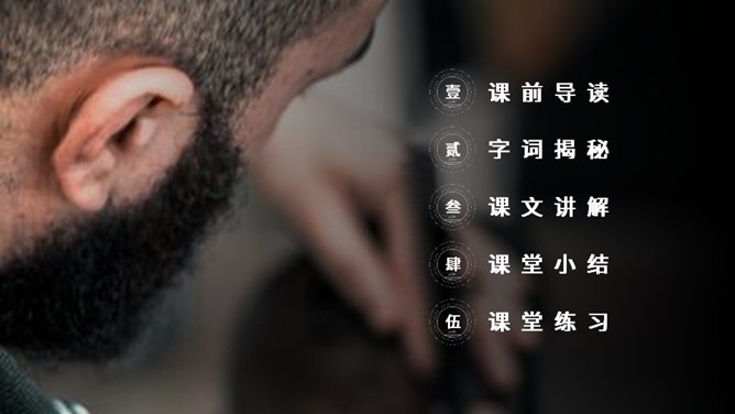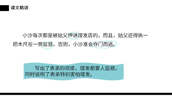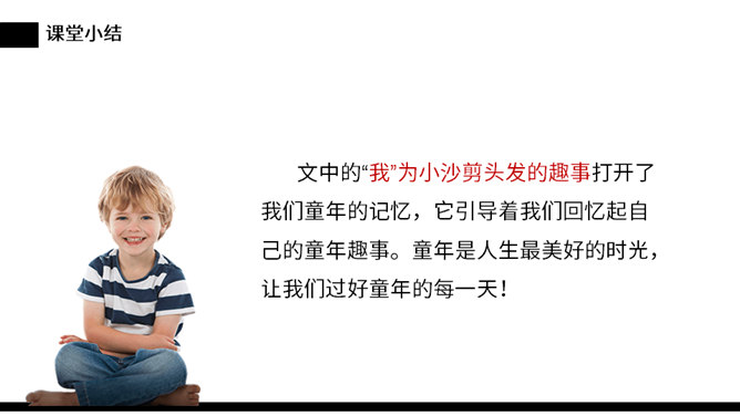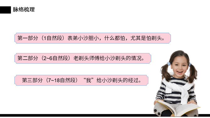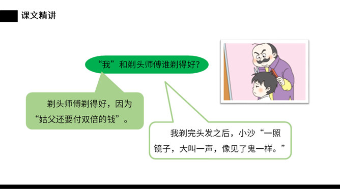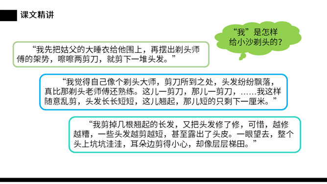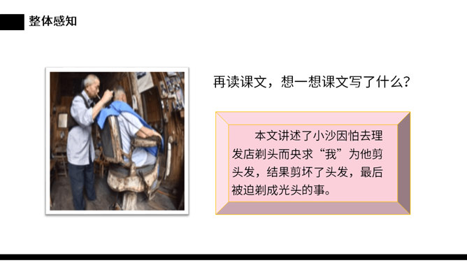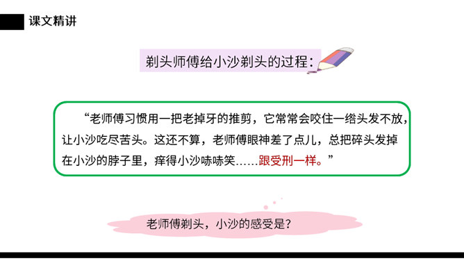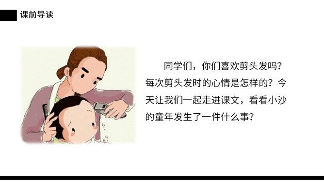 同学们,你们喜欢剪头发吗?每次剪头发时的心情是怎样的?今天让我们一起走进课文,看看小沙的童年发生了一件什么事?文中的“我”为小沙剪头发的趣事打开了我们童年的记忆,它引导着我们回忆起自己的童年趣事。童年是人生最美好的时光,让我们过好童年的每一天!1.把今天新认识的字读给父母或朋友听听。 2.小练笔:文中写了作者的表弟小沙的两次理发经历,现实生活中你理过发吗?有什么感想或感受?试着写一写。所属专题:剃头大师ppt。