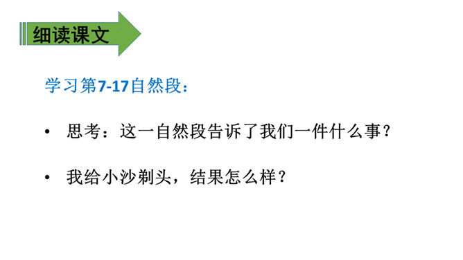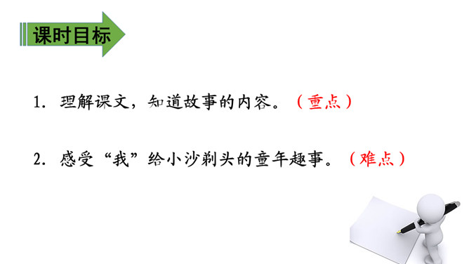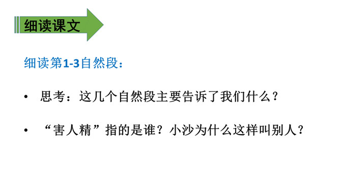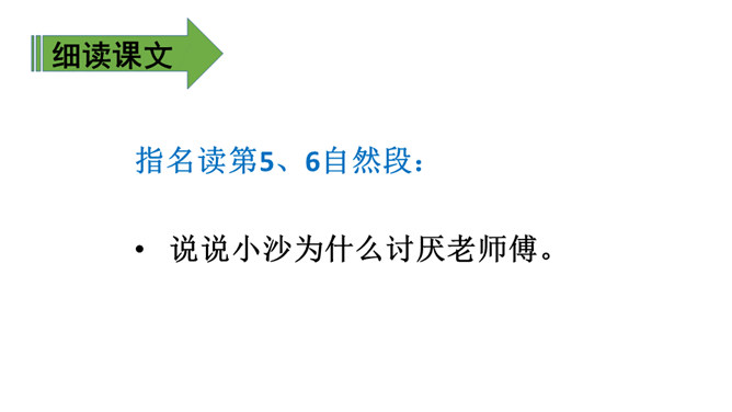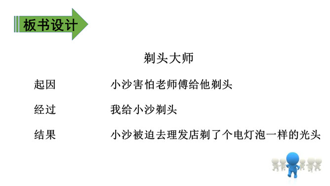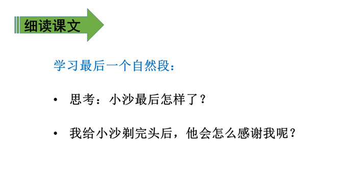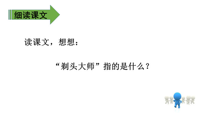 1. 理解课文,知道故事的内容。(重点)2. 感受“我”给小沙剃头的童年趣事。(难点)读课文,想想:“剃头大师”指的是什么?细读第1-3自然段:思考:这几个自然段主要告诉了我们什么?“害人精”指的是谁?小沙为什么这样叫别人?学习第4-6自然段:说说这一自然段共有几句话。自由读课文,找出本自然段讲了一个什么故事。指名读第5、6自然段:说说小沙为什么讨厌老师傅。所属专题:剃头大师ppt。
