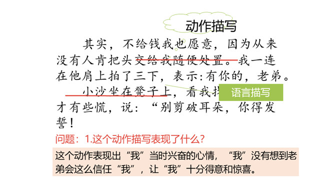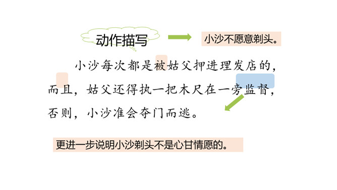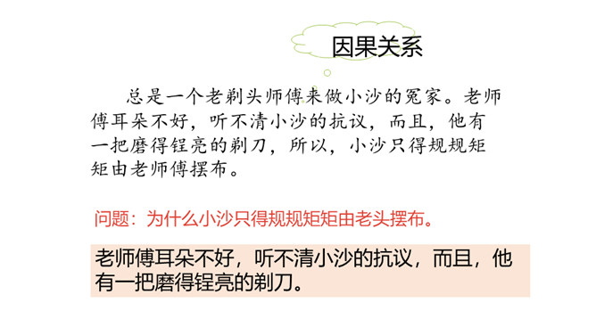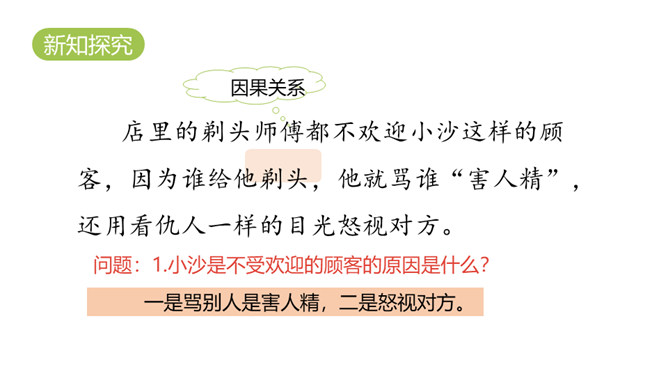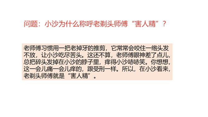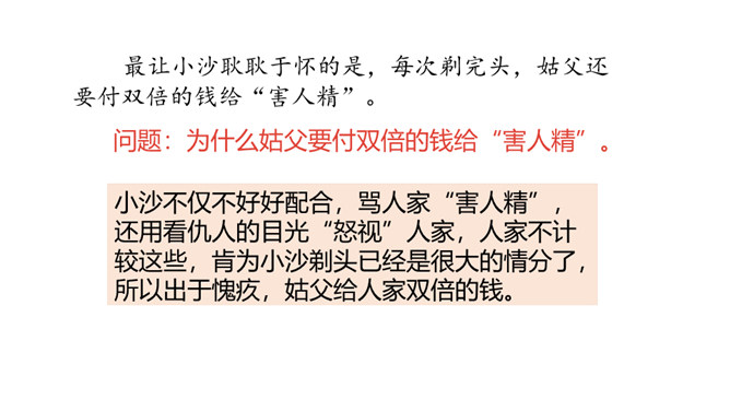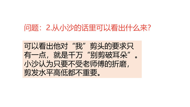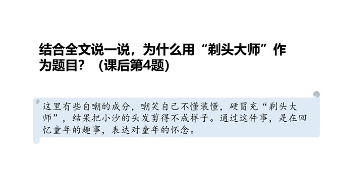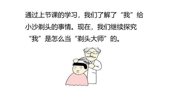 课文写的是发生在“我”和表弟小沙之间的一件令人啼笑皆非的故事:表弟怕到理发店剃头“受刑,”让“我”给他剪头发,“我”乱剪一通,结果表弟不得不剃了个光头,姑父睡衣上的头发怎么也清除不干净。故事真实地表现了儿童有趣的生活和天真无邪的性格特点。文中写了作者的表弟小沙的两次理发经历,现实生活中你理过发吗?有什么感想或感受?试着写一写。问题:为什么说“世界上没有比他更优秀的顾客了”?