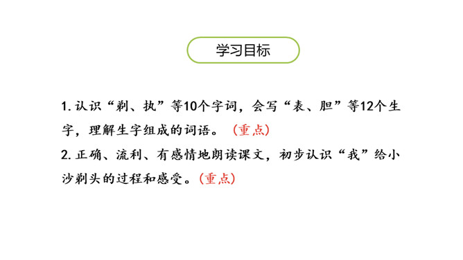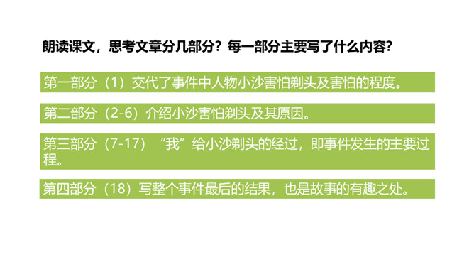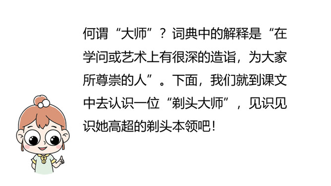 何谓“大师”?词典中的解释是“在学问或艺术上有很深的造诣,为大家所尊崇的人”。下面,我们就到课文中去认识一位“剃头大师”,见识见识她高超的剃头本领吧!1.认识“剃、执”等10个字词,会写“表、胆”等12个生字,理解生字组成的词语。 (重点)2.正确、流利、有感情地朗读课文,初步认识“我”给小沙剃头的过程和感受。(重点)朗读课文,思考文章分几部分?每一部分主要写了什么内容?所属专题:剃头大师ppt。