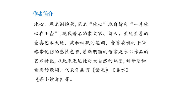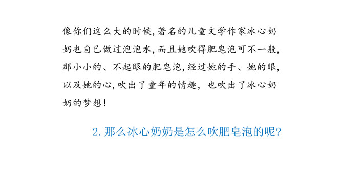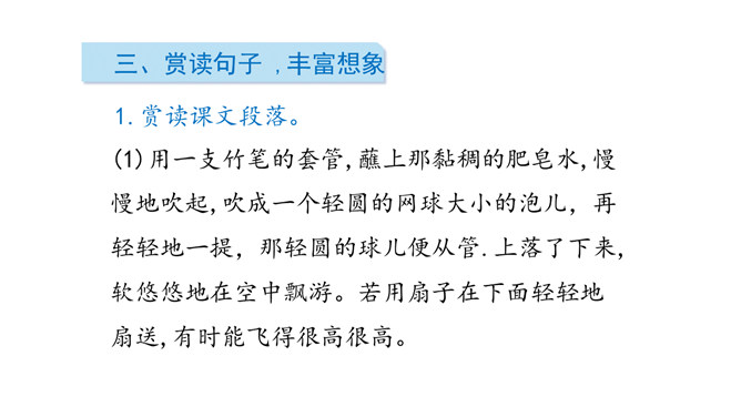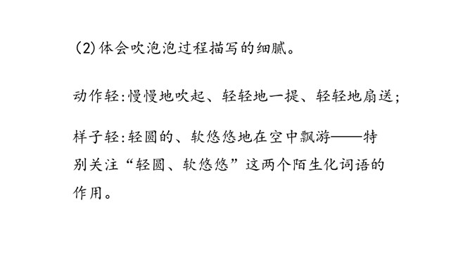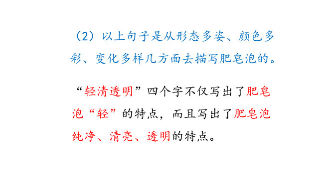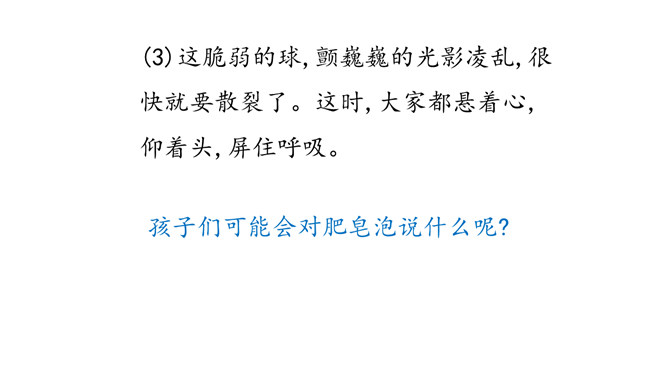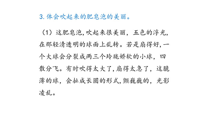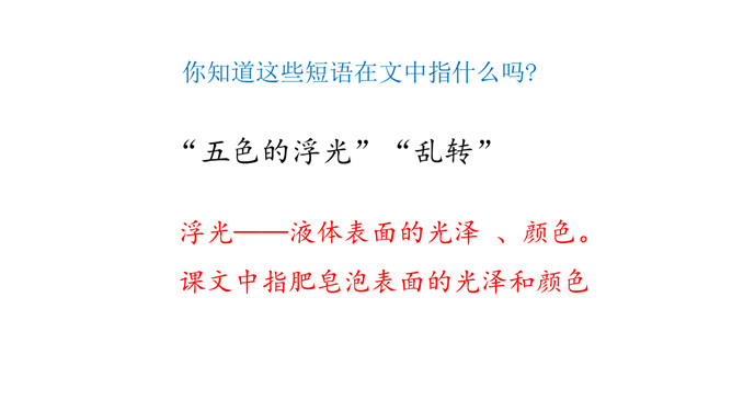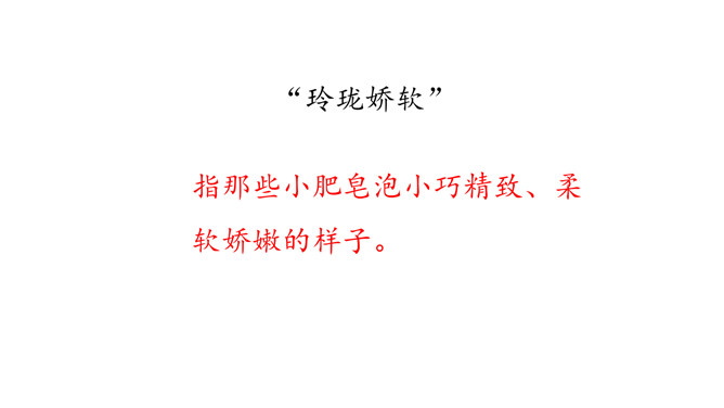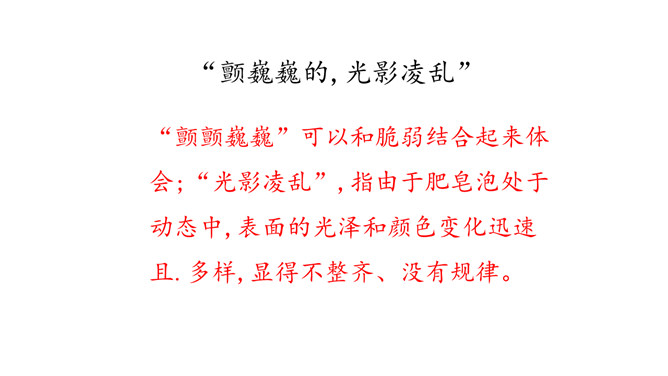 “轻清透明”四个字不仅写出了肥皂泡“轻”的特点,而且写出了肥皂泡纯净、清亮、透明的特点。浮光——液体表面的光泽 、颜色。课文中指肥皂泡表面的光泽和颜色。指那些小肥皂泡小巧精致、柔软娇嫩的样子。“颤颤巍巍”可以和脆弱结合起来体会;“光影凌乱”,指由于肥皂泡处于动态中,表面的光泽和颜色变化迅速且.多样,显得不整齐、没有规律。将描写优美的句子摘抄在积累本上。对比阅读:林海音的《我的童玩——小脚儿娘》。所属专题:肥皂泡ppt。