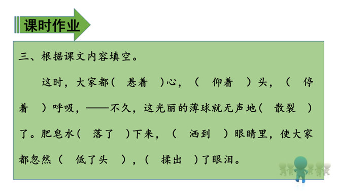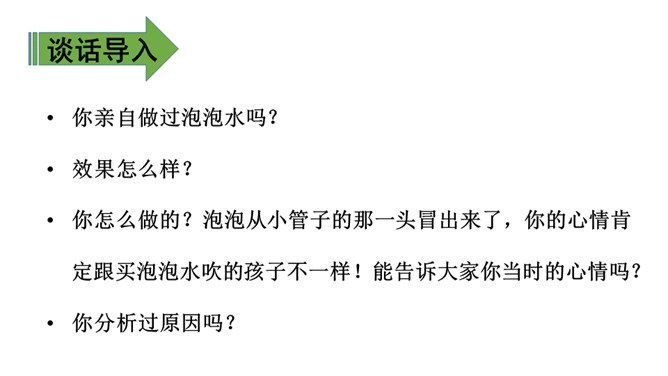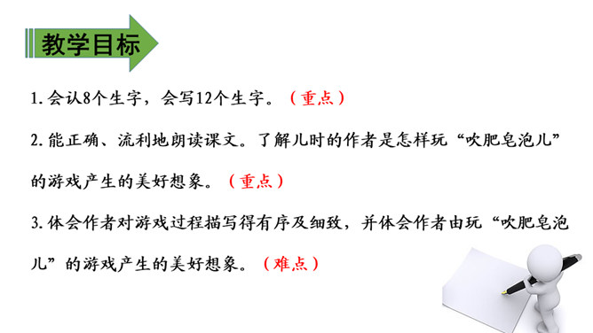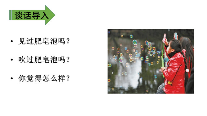 1.会认8个生字,会写12个生字。(重点)2.能正确、流利地朗读课文。了解儿时的作者是怎样玩“吹肥皂泡儿”的游戏产生的美好想象。(重点)3.体会作者对游戏过程描写得有序及细致,并体会作者由玩“吹肥皂泡儿”的游戏产生的美好想象。(难点)1. 会认8个生字,会写12个生字。(重点)2. 能正确、流利地朗读课文。(重点)你怎么做的?泡泡从小管子的那一头冒出来了,你的心情肯定跟买泡泡水吹的孩子不一样!能告诉大家你当时的心情吗?所属专题:肥皂泡ppt。