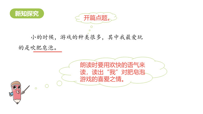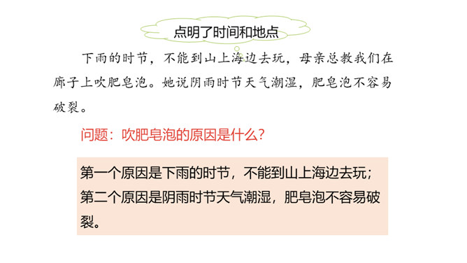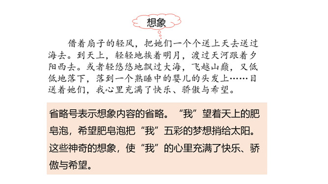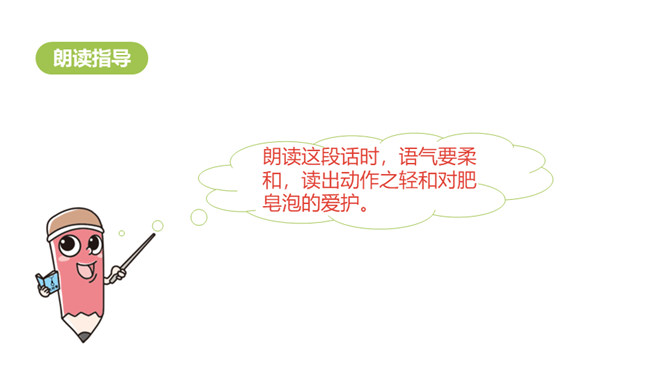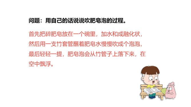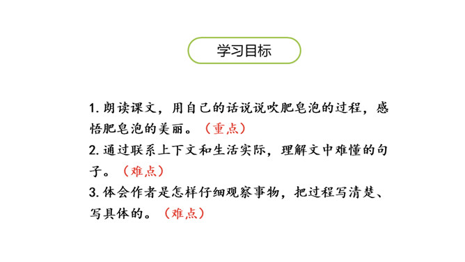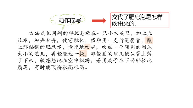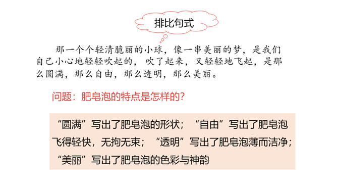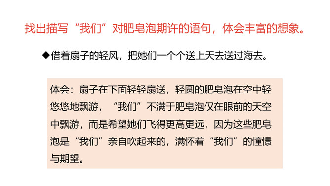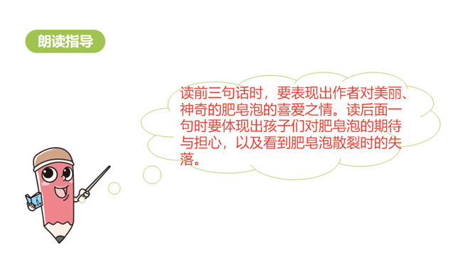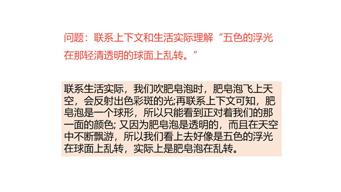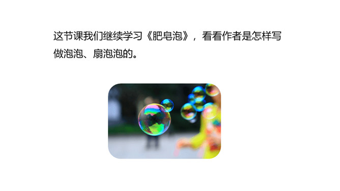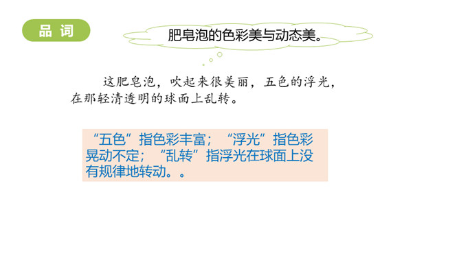 问题:用自己的话说说吹肥皂泡的过程。首先把碎肥皂放在一个碗里,加水和成融化状,然后用一支竹套管蘸着肥皂水慢慢吹成个泡泡,最后轻轻一提,肥皂泡会从竹管子上落下来,在空中飘浮。“五色”指色彩丰富;“浮光”指色彩晃动不定;“乱转”指浮光在球面上没有规律地转动。读前三句话时,要表现出作者对美丽、神奇的肥皂泡的喜爱之情。读后面一句时要体现出孩子们对肥皂泡的期待与担心,以及看到肥皂泡散裂时的失落。所属专题:肥皂泡ppt。