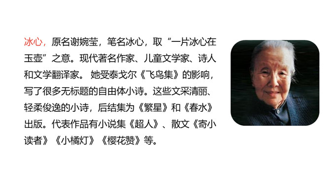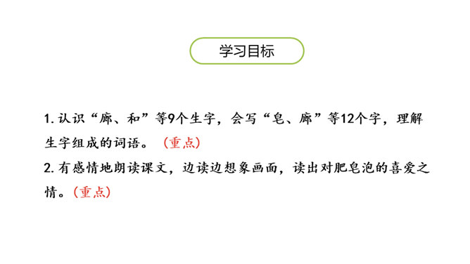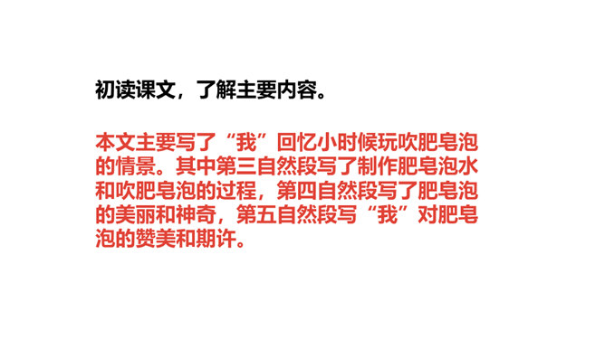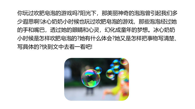 初读课文,了解主要内容。本文主要写了“我”回忆小时候玩吹肥皂泡的情景。其中第三自然段写了制作肥皂泡水和吹肥皂泡的过程,第四自然段写了肥皂泡的美丽和神奇,第五自然段写“我”对肥皂泡的赞美和期许。1.认识“廊、和”等9个生字,会写“皂、廊”等12个字,理解生字组成的词语。 (重点)2.有感情地朗读课文,边读边想象画面,读出对肥皂泡的喜爱之情。(重点)冰心奶奶小时候是怎样吹肥皂泡的?她有什么体会?所属专题:肥皂泡ppt。
