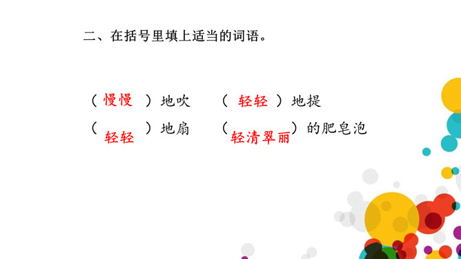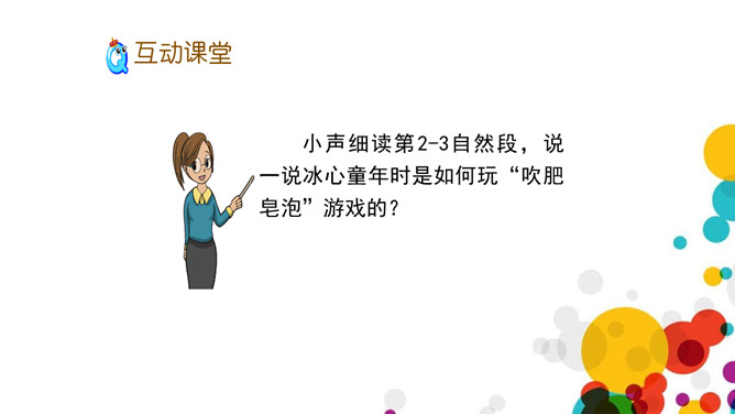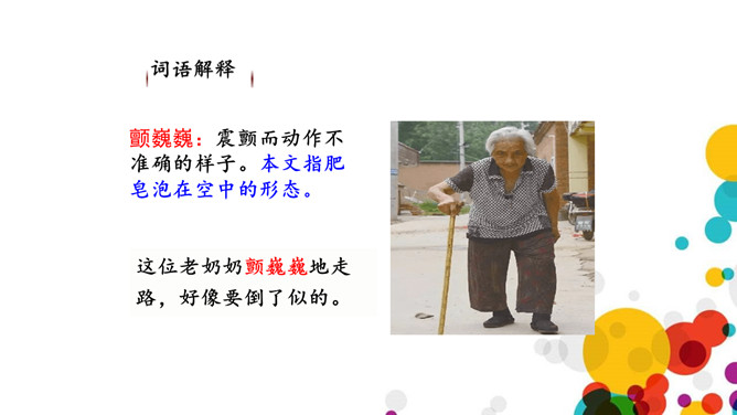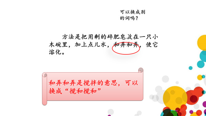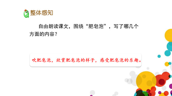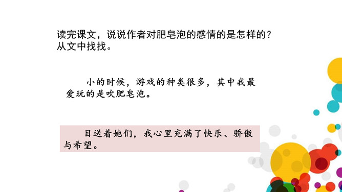 读完课文,说说作者对肥皂泡的感情的是怎样的?从文中找找。上节课我们学习了生字,了解了课文的大概内容,这节课,我们就来继续看看作者是怎样写做泡泡、吹泡泡的、扇泡泡的。和弄和弄是搅拌的意思,可以换成“搅和搅和”。作者通过“蘸、吹、提、扇”这四个动词,将吹泡泡的过程详细具体的写了出来,给人一种身临其境的感觉,非常好。说一说:试着用“首先……然后……接着……”这样的一组词语将吹肥皂泡的游戏介绍一下。所属专题:肥皂泡ppt。