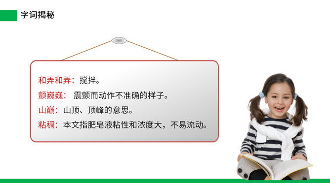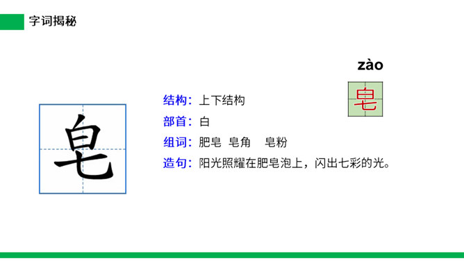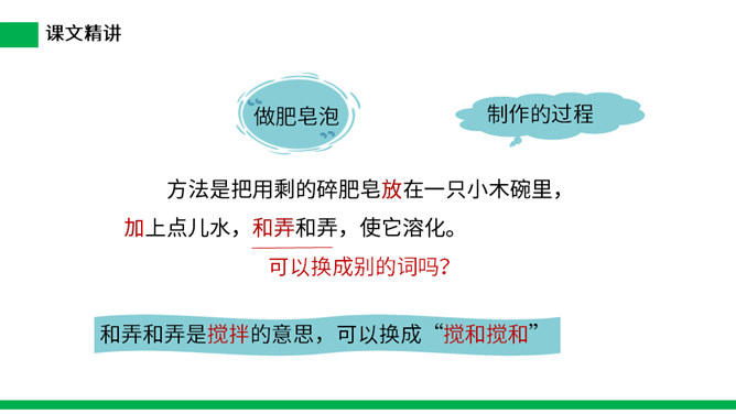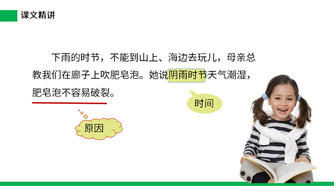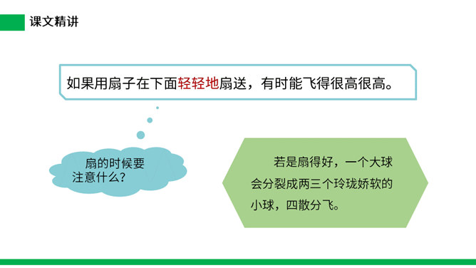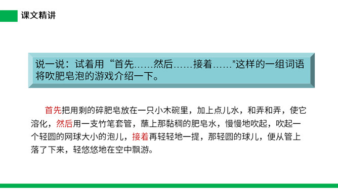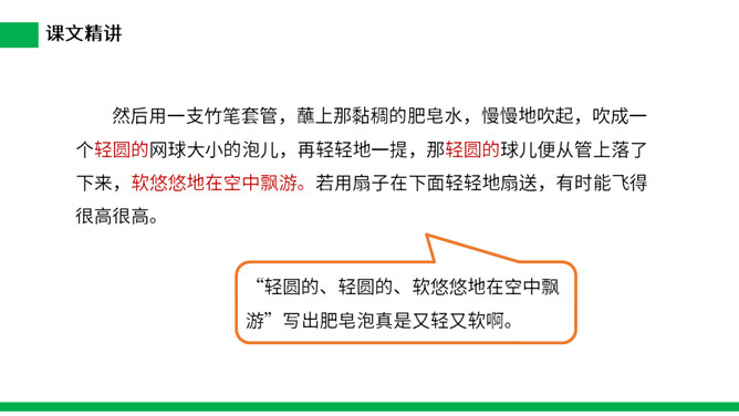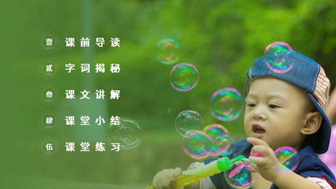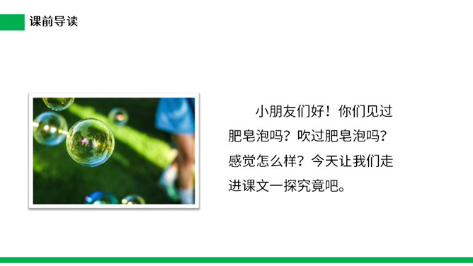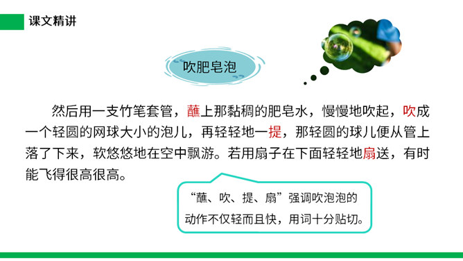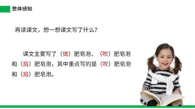 1.把今天新认识的字读给父母或朋友听听。 2.小练笔:仿照文中第五自然段,写写这些泡泡还可能飞到哪里去。 本文讲了作者回忆自己小时候玩吹肥皂泡游戏的事,表现了孩子们的童真、童趣,也表达了作者对童年时代快乐生活的留恋之情。(1)不认识的字可以看拼音,或者请教老师和同学。(2)读准每一个字的字音,圈出生字词;(3)读通每个句子,读不通顺的多读几遍;(4)给每个自然段写上序号。所属专题:肥皂泡ppt。