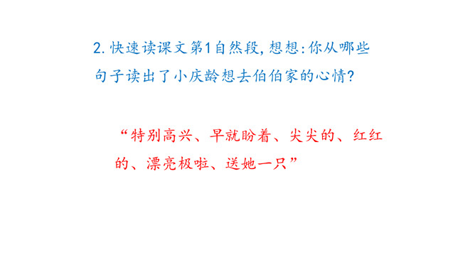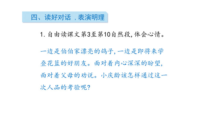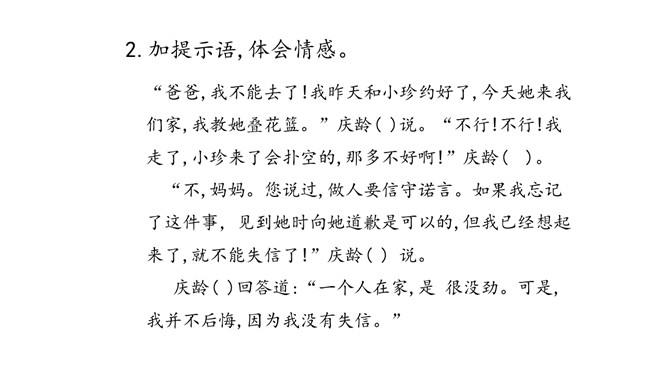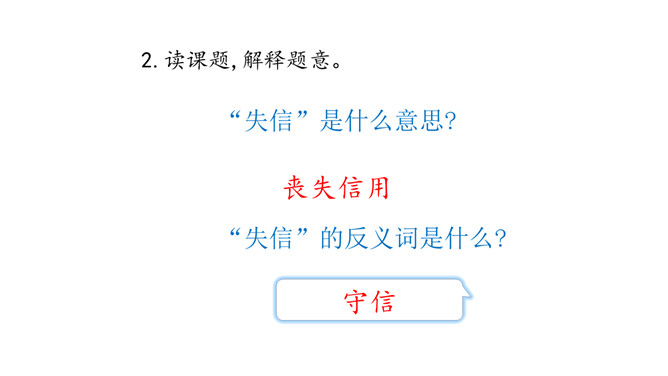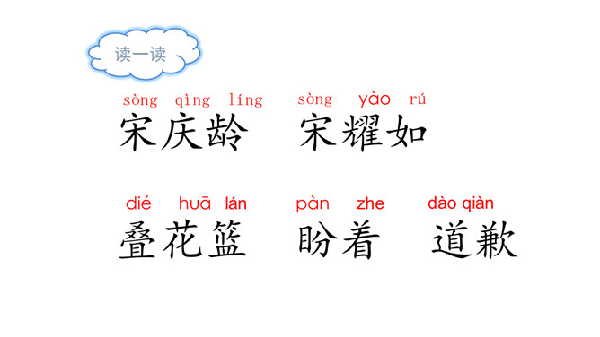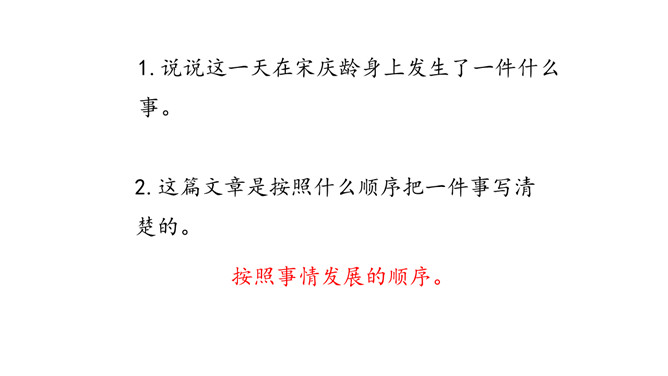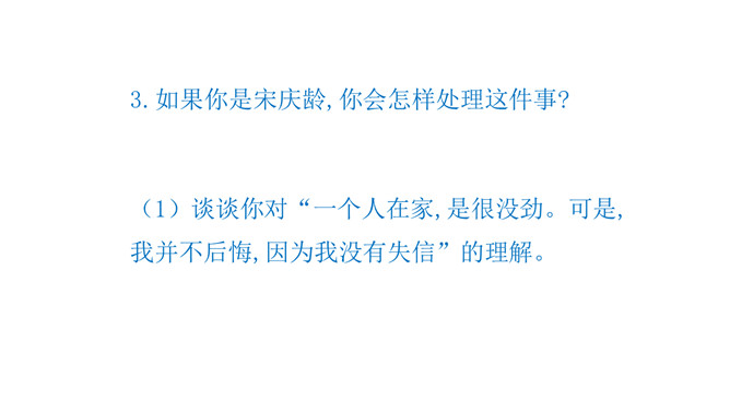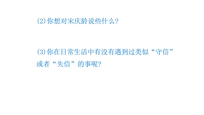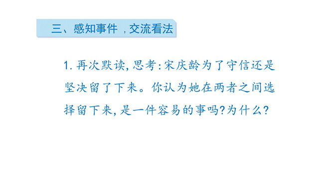 这是一篇略读课文,同学们自读阅读提示,说说从中知道了什么? 1.说说这一天在宋庆龄身上发生了一件什么事。2.这篇文章是按照什么顺序把一件事写清楚的。按照事情发展的顺序。再次默读,思考:宋庆龄为了守信还是坚决留了下来。你认为她在两者之间选择留下来,是一件容易的事吗?为什么?快速读课文第1自然段,想想:你从哪些句子读出了小庆龄想去伯伯家的心情?自由读课文第3至第10自然段,体会心情。所属专题:我不能失信ppt。