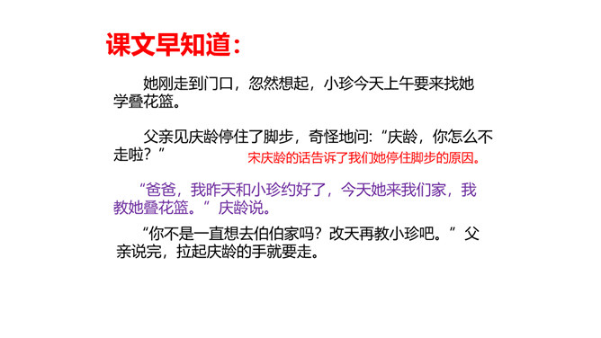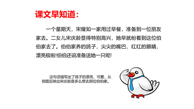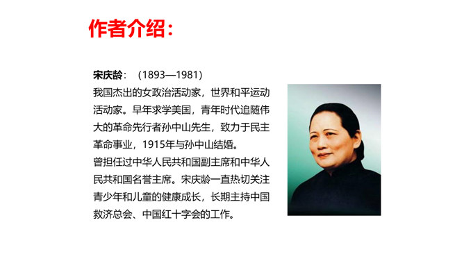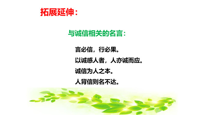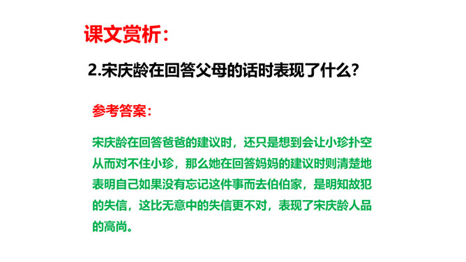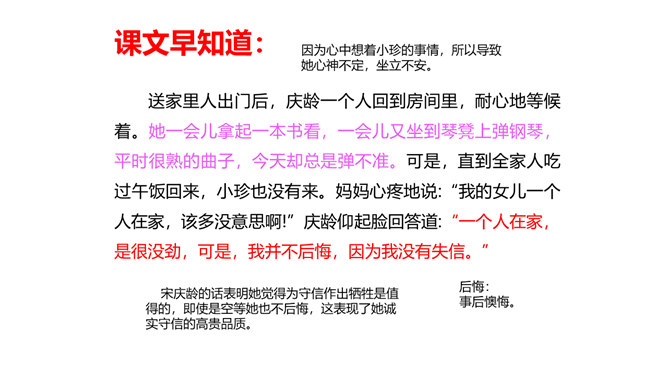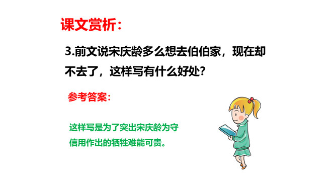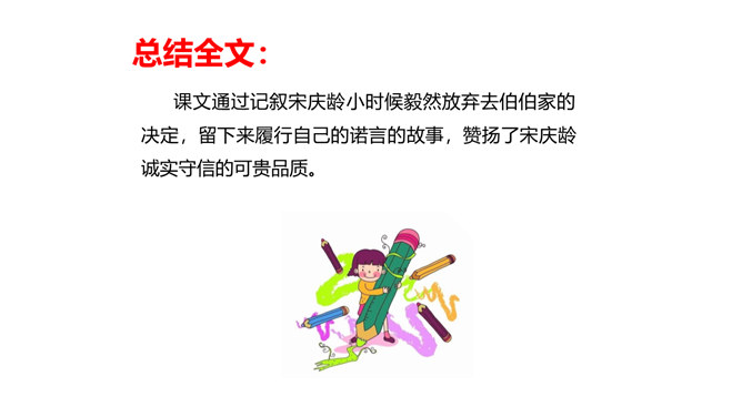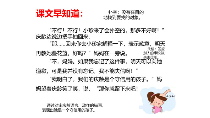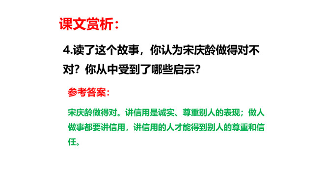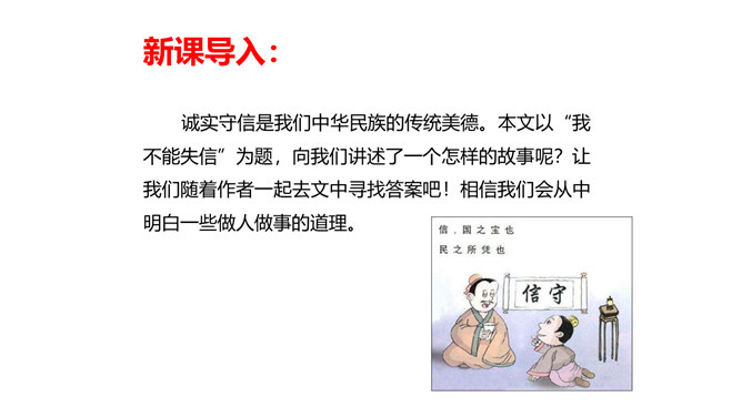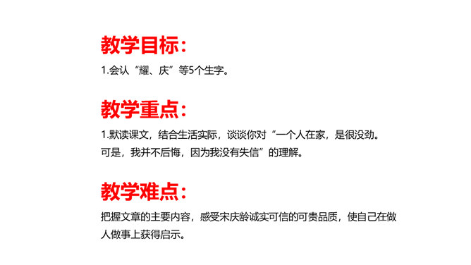 教学目标:会认“耀、庆”等5个生字。教学重点:默读课文,结合生活实际,谈谈你对“一个人在家,是很没劲。可是,我并不后悔,因为我没有失信”的理解。教学难点:把握文章的主要内容,感受宋庆龄诚实可信的可贵品质,使自己在做人做事上获得启示。新课导入:诚实守信是我们中华民族的传统美德。本文以“我不能失信”为题,向我们讲述了一个怎样的故事呢?让我们随着作者一起去文中寻找答案吧!相信我们会从中明白一些做人做事的道理。所属专题:我不能失信ppt。