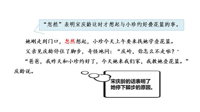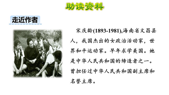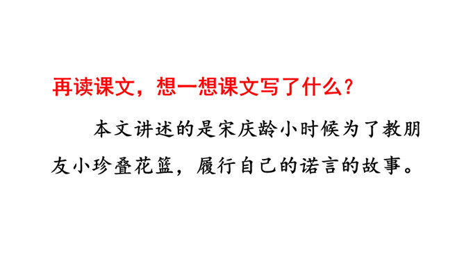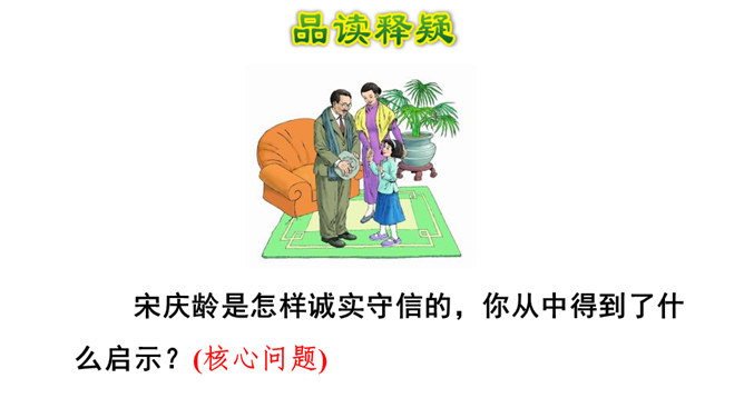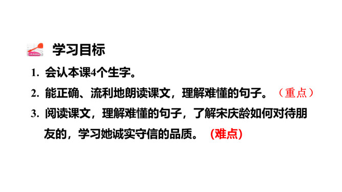 我们一起走进课文,去了解宋庆龄小时候的故事。1. 会认本课4个生字。2. 能正确、流利地朗读课文,理解难懂的句子。(重点)3. 阅读课文,理解难懂的句子,了解宋庆龄如何对待朋友的,学习她诚实守信的品质。(难点)第一个句子好,这两个句子的区别就在于“抽”和 “拿”用的不同,“拿”不用费任何力气,而“抽”则是很用力的往出拿,一个“抽”字说明了宋庆龄当时的决心非常大。所属专题:我不能失信ppt。