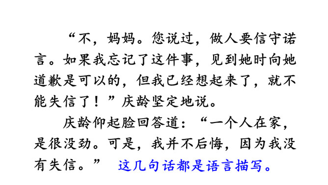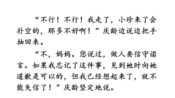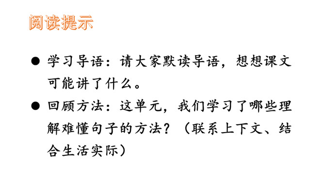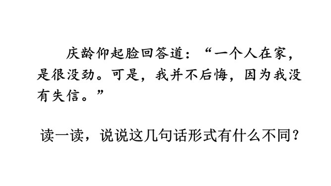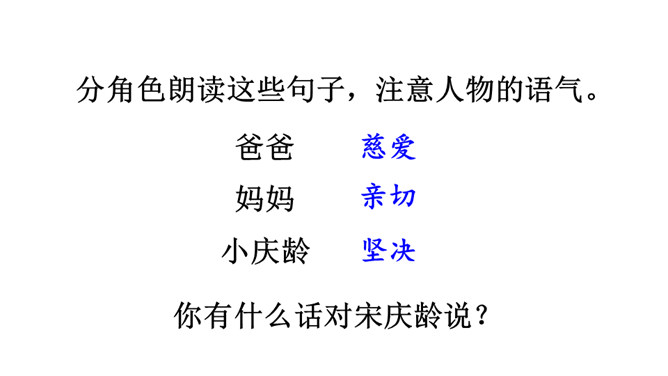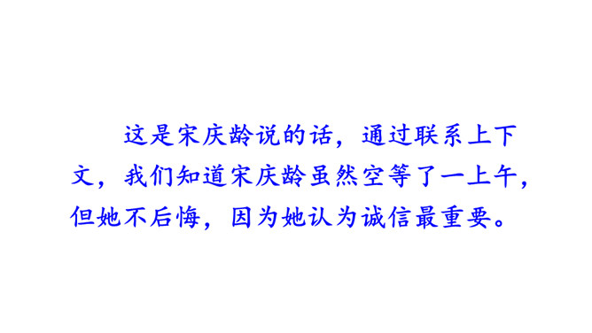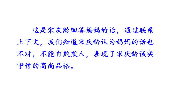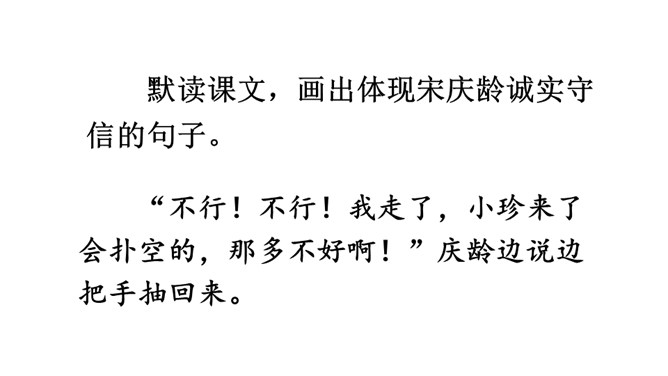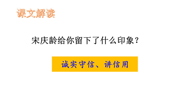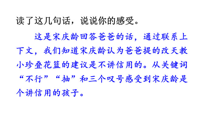 学习导语:请大家默读导语,想想课文可能讲了什么。回顾方法:这单元,我们学习了哪些理解难懂句子的方法?(联系上下文、结合生活实际)明确目标:这节课,我们继续运用联系上下文、结合生活实际等方法来理解句子。自由朗读课文,读准字音,读通句子,说说课文主要讲了一件什么事,讲清时间、地点、人物、事件。这是宋庆龄回答爸爸的话,通过联系上下文,我们知道宋庆龄认为爸爸提的改天教小珍叠花篮的建议是不讲信用的。从关键词“不行”“抽”和三个叹号感受到宋庆龄是个讲信用的孩子。所属专题:我不能失信ppt。