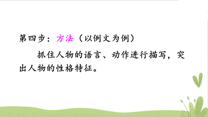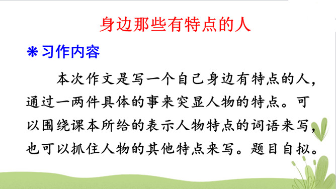 本次作文是写一个自己身边有特点的人,通过一两件具体的事来突显人物的特点。可以围绕课本所给的表示人物特点的词语来写,也可以抓住人物的其他特点来写。题目自拟。第一步:审题本次作文是写一个有特点的人,要抓住人物的某一个特点来写。第二步:主题。通过具体事例实现人物的某个性格特征。第四步:方法(以例文为例)抓住人物的语言、动作进行描写,突出人物的性格特征。所属专题:身边那些有特点的人ppt。