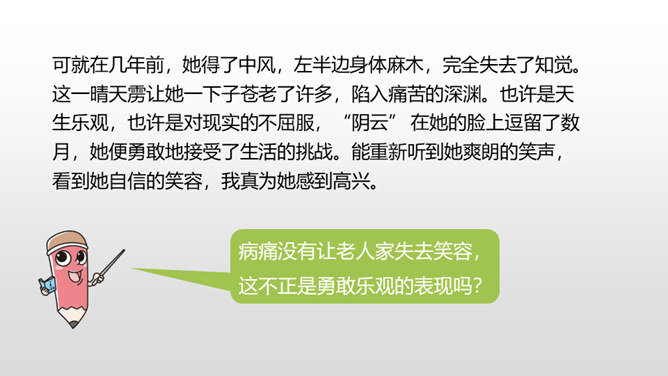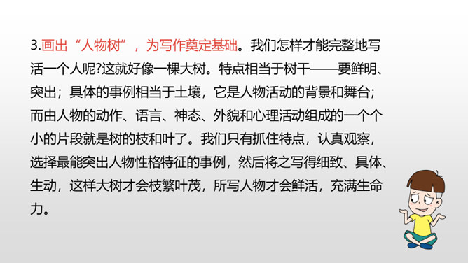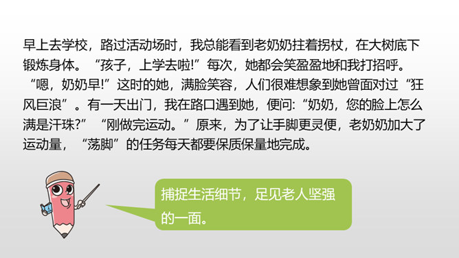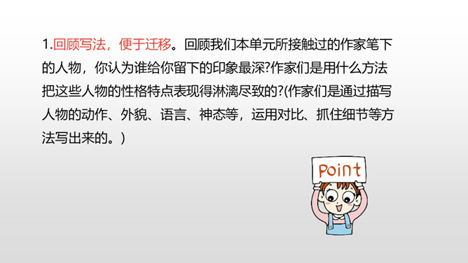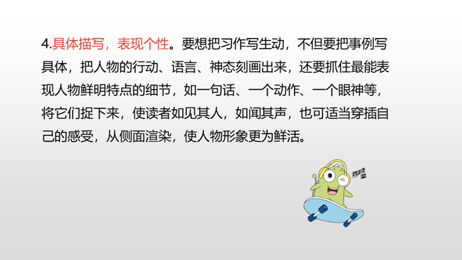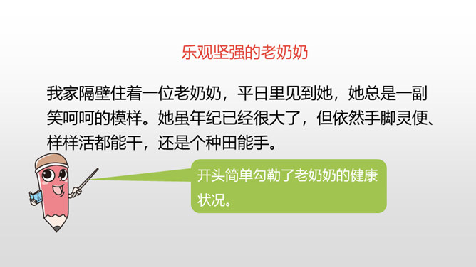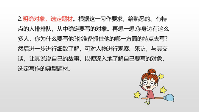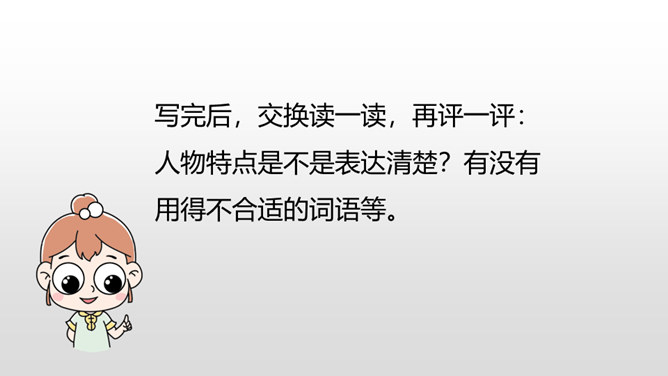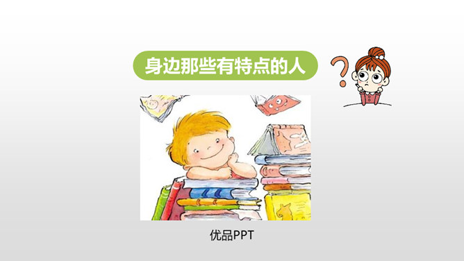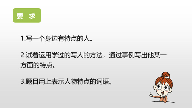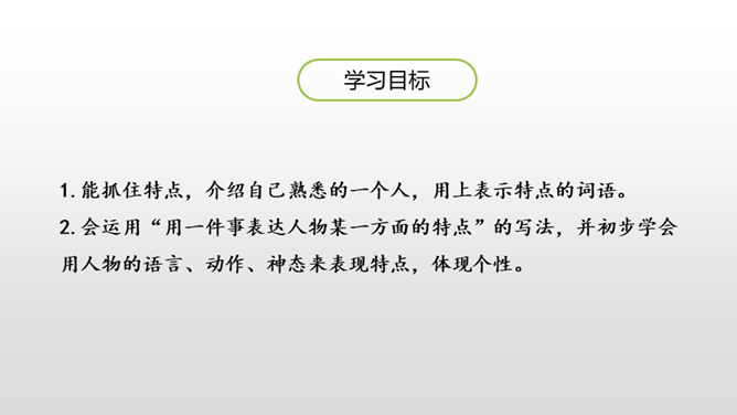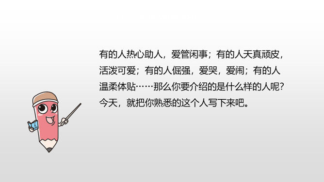 1.能抓住特点,介绍自己熟悉的一个人,用上表示特点的词语。2.会运用“用一件事表达人物某一方面的特点”的写法,并初步学会用人物的语言、动作、神态来表现特点,体现个性。有的人热心助人,爱管闲事;有的人天真顽皮,活泼可爱;有的人倔强,爱哭,爱闹;有的人温柔体贴……那么你要介绍的是什么样的人呢?今天,就把你熟悉的这个人写下来吧。看下面的词语,你能想到谁,为什么会想到她(他)?所属专题:身边那些有特点的人ppt。