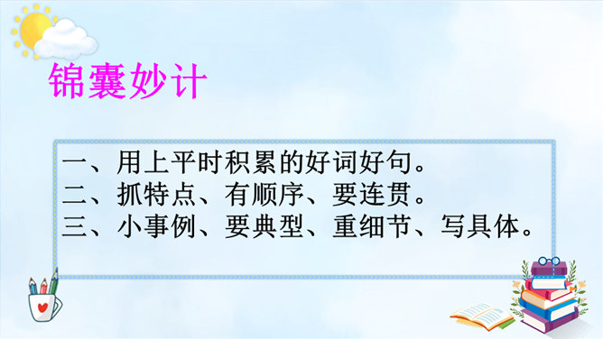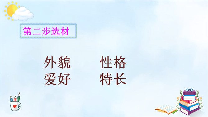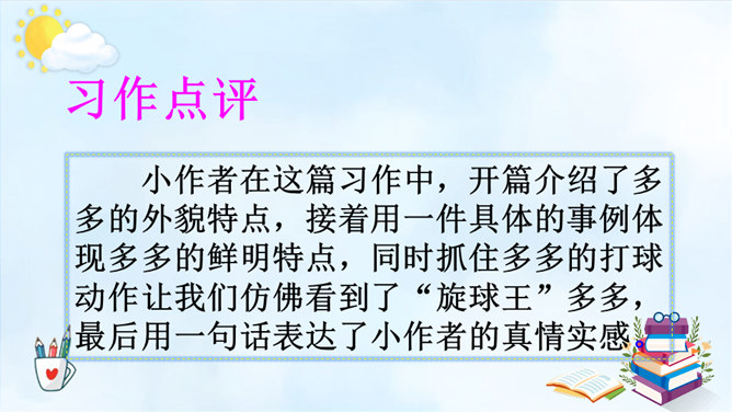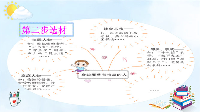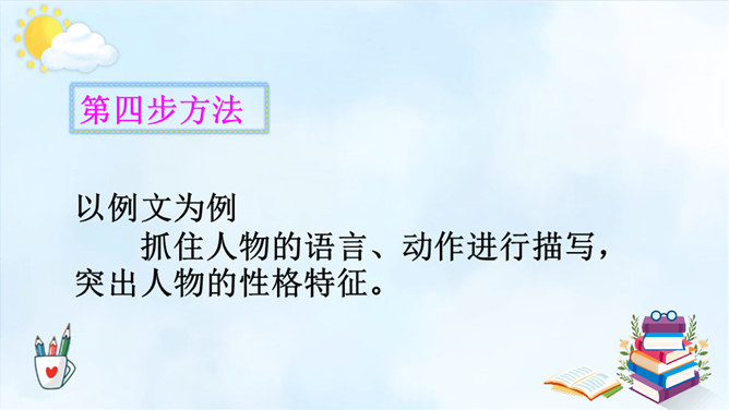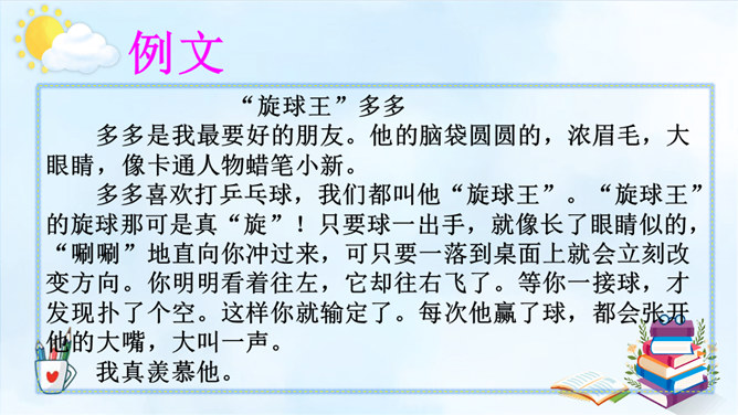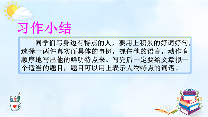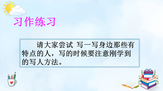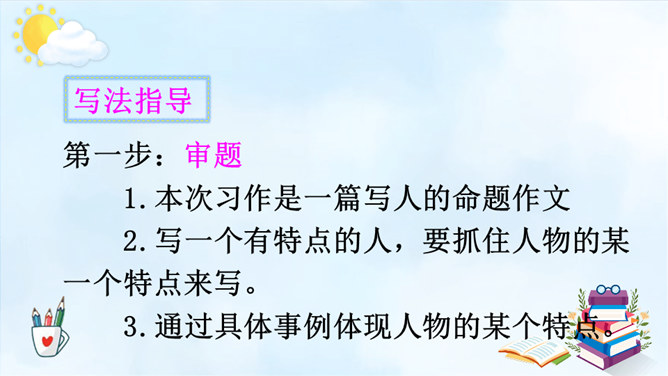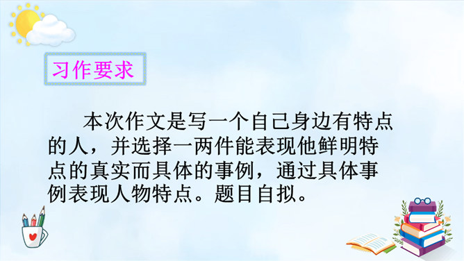 以例文为例,抓住人物的语言、动作进行描写,突出人物的性格特征。一、用上平时积累的好词好句。 二、抓特点、有顺序、要连贯。 三、小事例、要典型、重细节、写具体。请大家尝试 写一写身边那些有特点的人,写的时候要注意刚学到的写人方法。1.语句修改通顺,把标点符号修改正确,无错别字。2.人物介绍时是否用一两件真实而具体的事例来体现人物特点。3.是否描写人物的外貌、语言、心理活动。所属专题:身边那些有特点的人ppt。